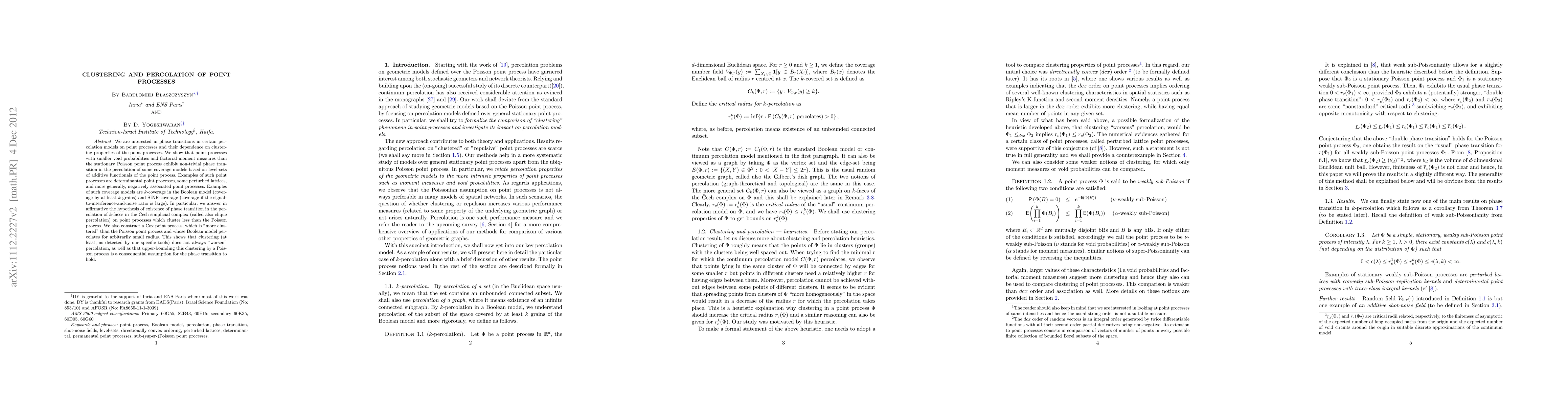 We are interested in phase transitions in certain percolation models on point processes and their dependence on clustering properties of the point processes. We show that point processes with smaller void probabilities and factorial moment measures than the stationary Poisson point process exhibit non-trivial phase transition in the percolation of some coverage models based on level-sets of additive functionals of the point process. Examples of such point processes are determinantal point processes, some perturbed lattices, and more generally, negatively associated point processes. Examples of such coverage models are $k$-coverage in the Boolean model (coverage by at least $k$ grains) and SINR-coverage (coverage if the signal-to-interference-and-noise ratio is large). In particular, we answer in affirmative the hypothesis of existence of phase transition in the percolation of $k$-faces in the \v{C}ech simplicial complex (called also clique percolation) on point processes which cluster less than the Poisson process. We also construct a Cox point process, which is "more clustered" than the Poisson point process and whose Boolean model percolates for arbitrarily small radius. This shows that clustering (at least, as detected by our specific tools) does not always "worsen" percolation, as well as that upper-bounding this clustering by a Poisson process is a consequential assumption for the phase transition to hold.