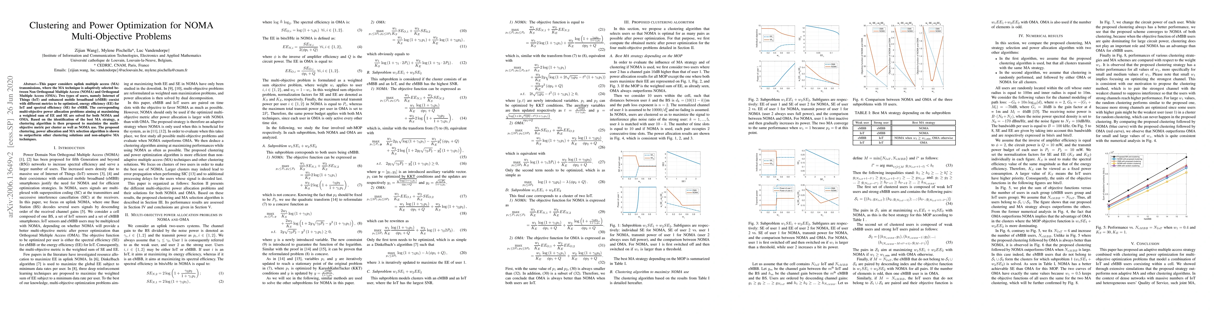 This paper considers uplink multiple access (MA) transmissions, where the MA technique is adaptively selected between Non Orthogonal Multiple Access (NOMA) and Orthogonal Multiple Access (OMA). Two types of users, namely Internet of Things (IoT) and enhanced mobile broadband (eMBB) coexist with different metrics to be optimized, energy efficiency (EE) for IoT and spectral efficiency (SE) for eMBB. The corresponding multi-objective power allocation problems aiming at maximizing a weighted sum of EE and SE are solved for both NOMA and OMA. Based on the identification of the best MA strategy, a clustering algorithm is then proposed to maximize the multi-objective metric per cluster as well as NOMA use. The proposed clustering, power allocation and MA selection algorithm is shown to outperform other clustering solutions and non-adaptive MA techniques.