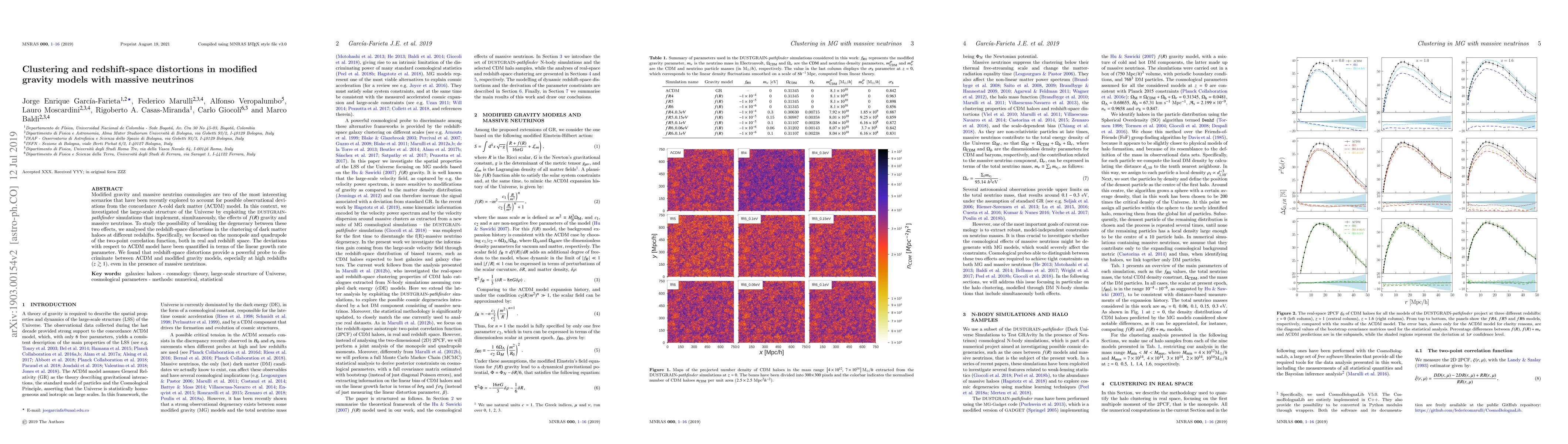 This paper investigates the large-scale structure of the Universe in modified gravity and massive neutrino cosmologies using the \dustp simulations. It finds that redshift-space distortions, particularly the monopole and quadrupole of the two-point correlation function, effectively distinguish these models from the $\Lambda$CDM model, especially at high redshifts.