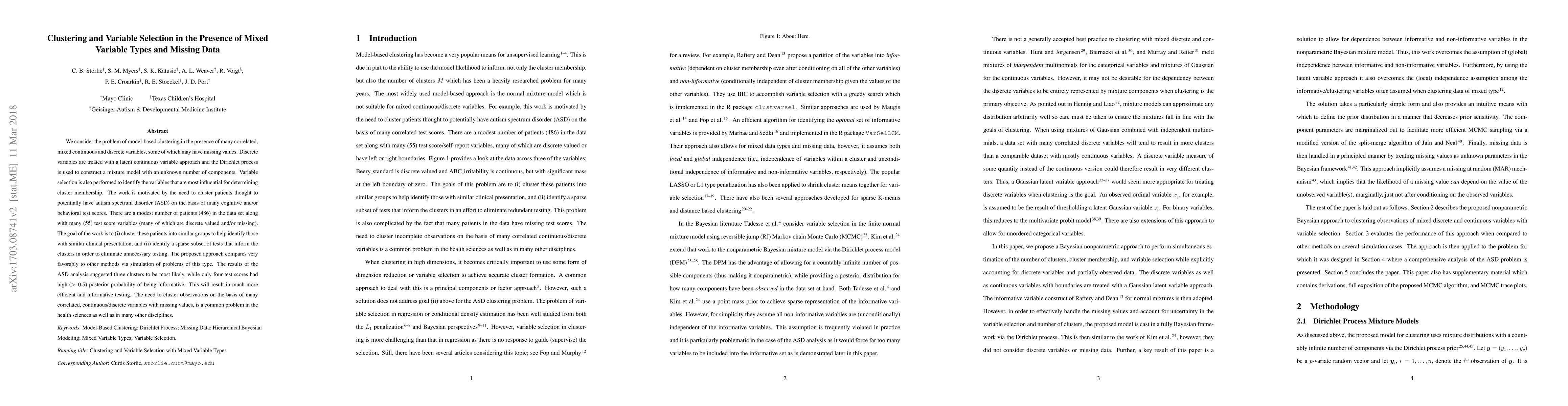 We consider the problem of model-based clustering in the presence of many correlated, mixed continuous and discrete variables, some of which may have missing values. Discrete variables are treated with a latent continuous variable approach and the Dirichlet process is used to construct a mixture model with an unknown number of components. Variable selection is also performed to identify the variables that are most influential for determining cluster membership. The work is motivated by the need to cluster patients thought to potentially have autism spectrum disorder (ASD) on the basis of many cognitive and/or behavioral test scores. There are a modest number of patients (~480) in the data set along with many (~100) test score variables (many of which are discrete valued and/or missing). The goal of the work is to (i) cluster these patients into similar groups to help identify those with similar clinical presentation, and (ii) identify a sparse subset of tests that inform the clusters in order to eliminate unnecessary testing. The proposed approach compares very favorably to other methods via simulation of problems of this type. The results of the ASD analysis suggested three clusters to be most likely, while only four test scores had high (>0.5) posterior probability of being informative. This will result in much more efficient and informative testing. The need to cluster observations on the basis of many correlated, continuous/discrete variables with missing values, is a common problem in the health sciences as well as in many other disciplines.