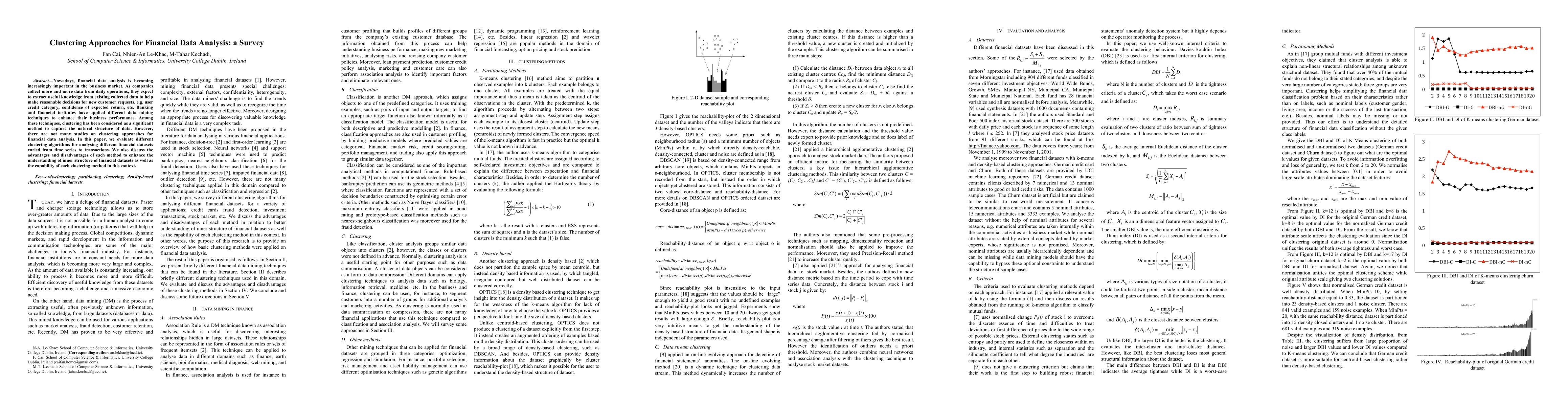 Nowadays, financial data analysis is becoming increasingly important in the business market. As companies collect more and more data from daily operations, they expect to extract useful knowledge from existing collected data to help make reasonable decisions for new customer requests, e.g. user credit category, confidence of expected return, etc. Banking and financial institutes have applied different data mining techniques to enhance their business performance. Among these techniques, clustering has been considered as a significant method to capture the natural structure of data. However, there are not many studies on clustering approaches for financial data analysis. In this paper, we evaluate different clustering algorithms for analysing different financial datasets varied from time series to transactions. We also discuss the advantages and disadvantages of each method to enhance the understanding of inner structure of financial datasets as well as the capability of each clustering method in this context.