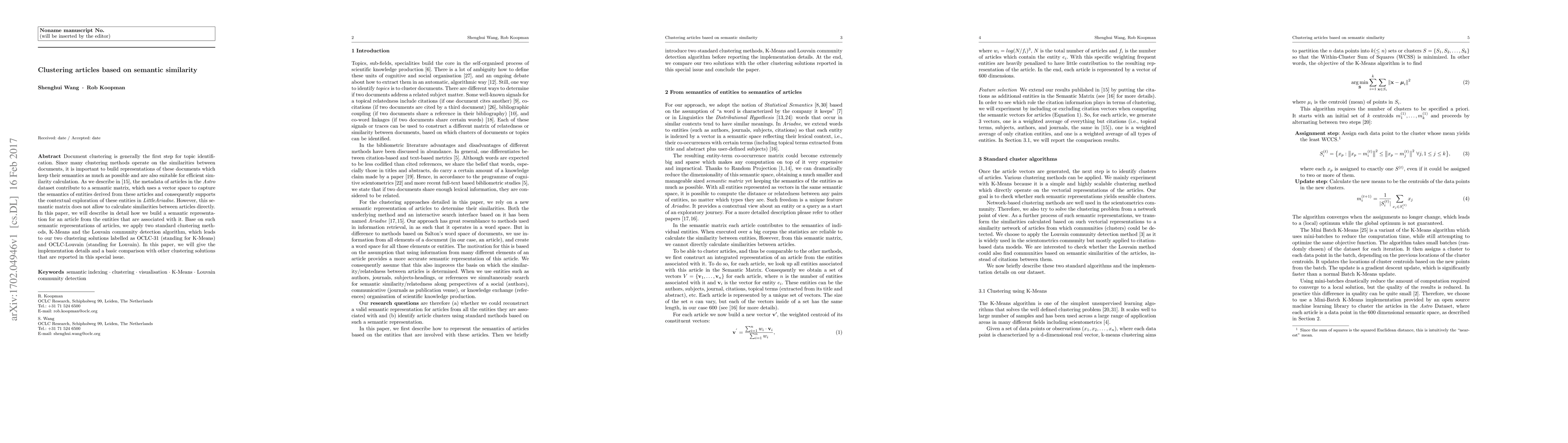Document clustering is generally the first step for topic identification. Since many clustering methods operate on the similarities between documents, it is important to build representations of these documents which keep their semantics as much as possible and are also suitable for efficient similarity calculation. The metadata of articles in the Astro dataset contribute to a semantic matrix, which uses a vector space to capture the semantics of entities derived from these articles and consequently supports the contextual exploration of these entities in LittleAriadne. However, this semantic matrix does not allow to calculate similarities between articles directly. In this paper, we will describe in detail how we build a semantic representation for an article from the entities that are associated with it. Base on such semantic representations of articles, we apply two standard clustering methods, K-Means and the Louvain community detection algorithm, which leads to our two clustering solutions labelled as OCLC-31 (standing for K-Means) and OCLC-Louvain (standing for Louvain). In this paper, we will give the implementation details and a basic comparison with other clustering solutions that are reported in this special issue.
