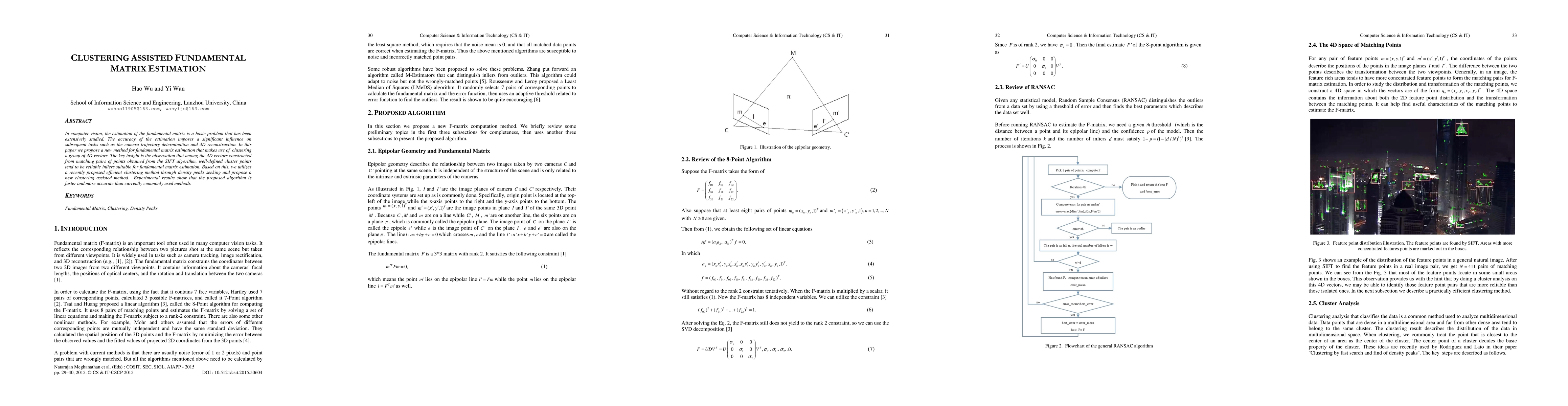 This paper proposes a novel clustering-assisted method for estimating the fundamental matrix in computer vision, leveraging clustering of 4D vectors derived from SIFT-matched point pairs. The method utilizes density peaks clustering for efficient identification of reliable inliers, leading to faster and more accurate fundamental matrix estimation compared to existing techniques.
