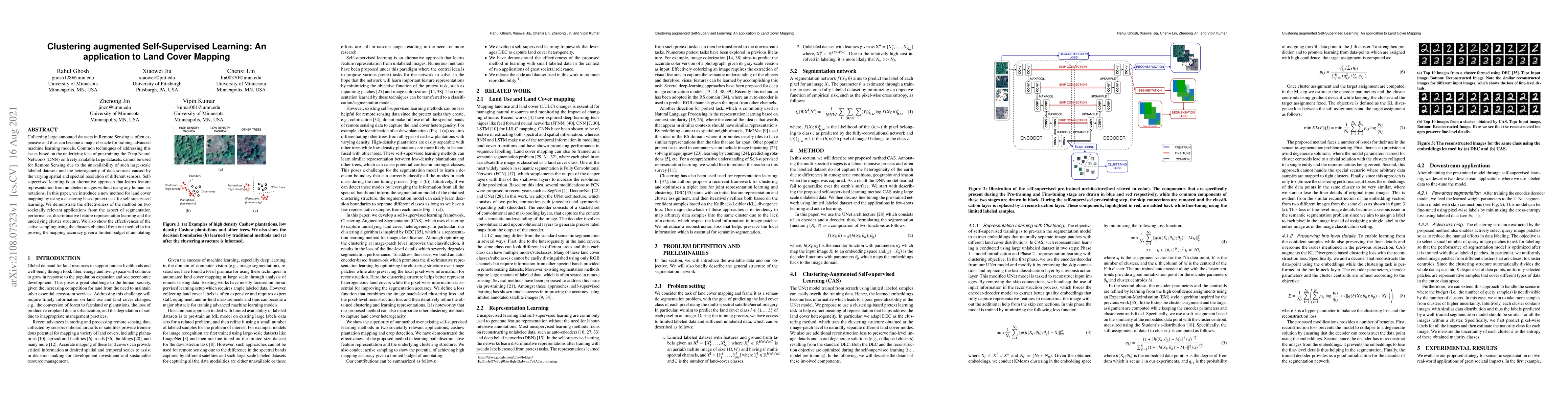 Collecting large annotated datasets in Remote Sensing is often expensive and thus can become a major obstacle for training advanced machine learning models. Common techniques of addressing this issue, based on the underlying idea of pre-training the Deep Neural Networks (DNN) on freely available large datasets, cannot be used for Remote Sensing due to the unavailability of such large-scale labeled datasets and the heterogeneity of data sources caused by the varying spatial and spectral resolution of different sensors. Self-supervised learning is an alternative approach that learns feature representation from unlabeled images without using any human annotations. In this paper, we introduce a new method for land cover mapping by using a clustering based pretext task for self-supervised learning. We demonstrate the effectiveness of the method on two societally relevant applications from the aspect of segmentation performance, discriminative feature representation learning and the underlying cluster structure. We also show the effectiveness of the active sampling using the clusters obtained from our method in improving the mapping accuracy given a limited budget of annotating.