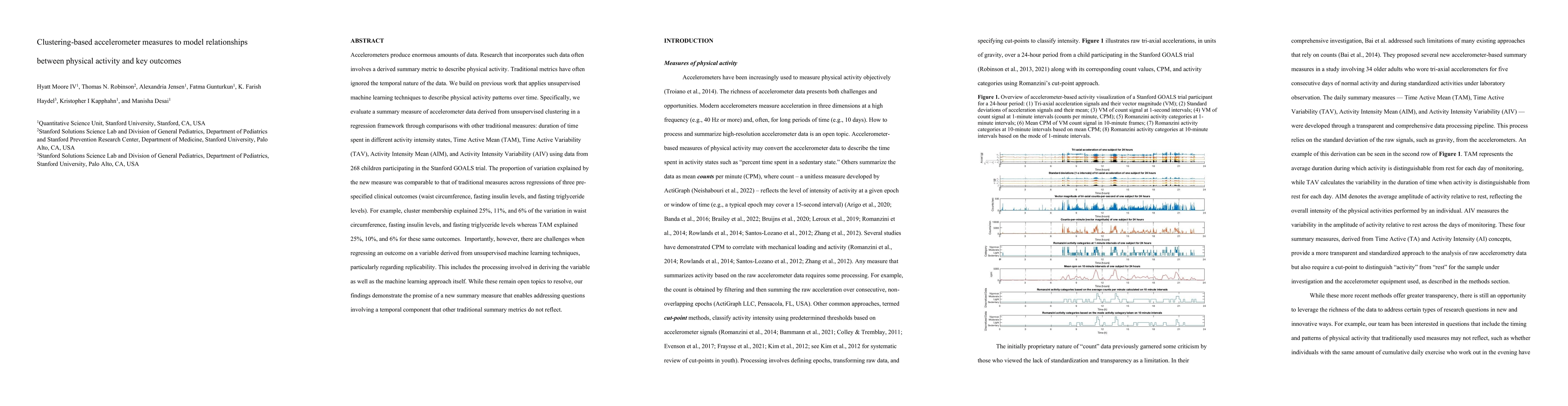 Accelerometers produce enormous amounts of data. Research that incorporates such data often involves a derived summary metric to describe physical activity. Traditional metrics have often ignored the temporal nature of the data. We build on previous work that applies unsupervised machine learning techniques to describe physical activity patterns over time. Specifically, we evaluate a summary measure of accelerometer data derived from unsupervised clustering in a regression framework through comparisons with other traditional measures: duration of time spent in different activity intensity states, Time Active Mean (TAM), Time Active Variability (TAV), Activity Intensity Mean (AIM), and Activity Intensity Variability (AIV) using data from 268 children participating in the Stanford GOALS trial. The proportion of variation explained by the new measure was comparable to that of traditional measures across regressions of three pre-specified clinical outcomes (waist circumference, fasting insulin levels, and fasting triglyceride levels). For example, cluster membership explained 25%, 11%, and 6% of the variation in waist circumference, fasting insulin levels, and fasting triglyceride levels whereas TAM explained 25%, 10%, and 6% for these same outcomes. Importantly, however, there are challenges when regressing an outcome on a variable derived from unsupervised machine learning techniques, particularly regarding replicability. This includes the processing involved in deriving the variable as well as the machine learning approach itself. While these remain open topics to resolve, our findings demonstrate the promise of a new summary measure that enables addressing questions involving a temporal component that other traditional summary metrics do not reflect.