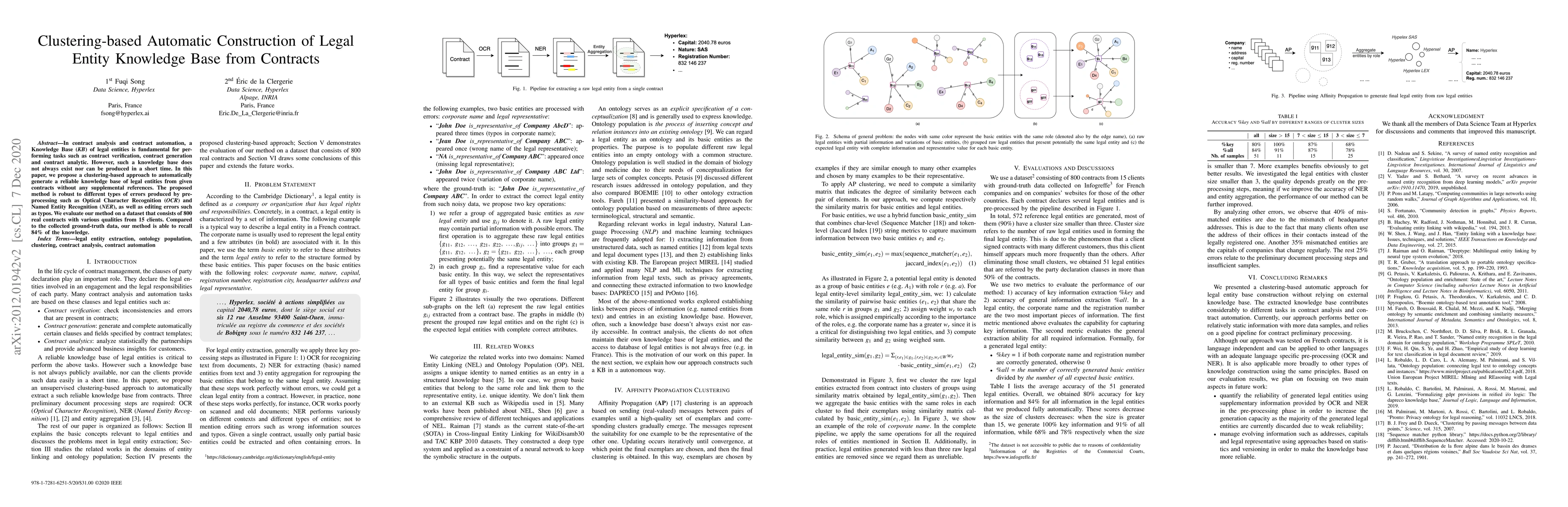 In contract analysis and contract automation, a knowledge base (KB) of legal entities is fundamental for performing tasks such as contract verification, contract generation and contract analytic. However, such a KB does not always exist nor can be produced in a short time. In this paper, we propose a clustering-based approach to automatically generate a reliable knowledge base of legal entities from given contracts without any supplemental references. The proposed method is robust to different types of errors brought by pre-processing such as Optical Character Recognition (OCR) and Named Entity Recognition (NER), as well as editing errors such as typos. We evaluate our method on a dataset that consists of 800 real contracts with various qualities from 15 clients. Compared to the collected ground-truth data, our method is able to recall 84\% of the knowledge.