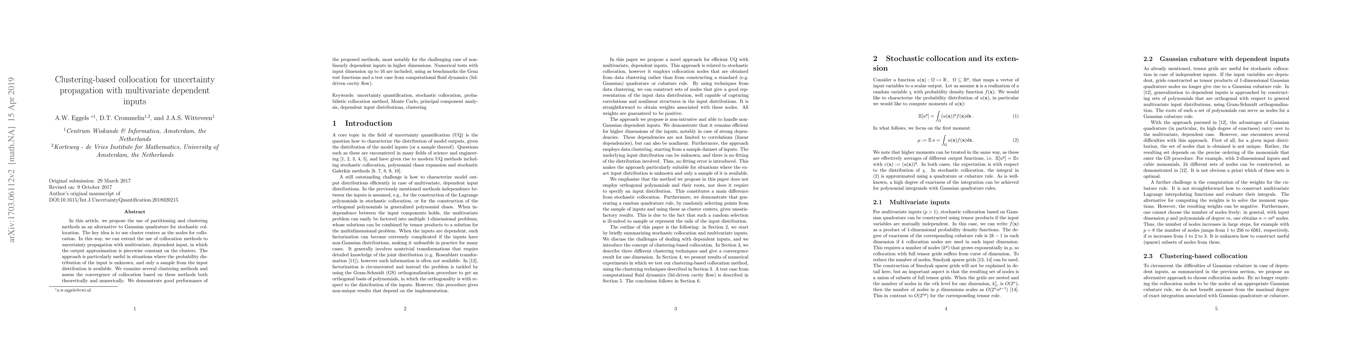 In this article, we propose the use of partitioning and clustering methods as an alternative to Gaussian quadrature for stochastic collocation. The key idea is to use cluster centers as the nodes for collocation. In this way, we can extend the use of collocation methods to uncertainty propagation with multivariate, dependent input, in which the output approximation is piecewise constant on the clusters. The approach is particularly useful in situations where the probability distribution of the input is unknown, and only a sample from the input distribution is available. We examine several clustering methods and assess the convergence of collocation based on these methods both theoretically and numerically. We demonstrate good performance of the proposed methods, most notably for the challenging case of nonlinearly dependent inputs in higher dimensions. Numerical tests with input dimension up to 16 are included, using as benchmarks the Genz test functions and a test case from computational fluid dynamics (lid-driven cavity flow).