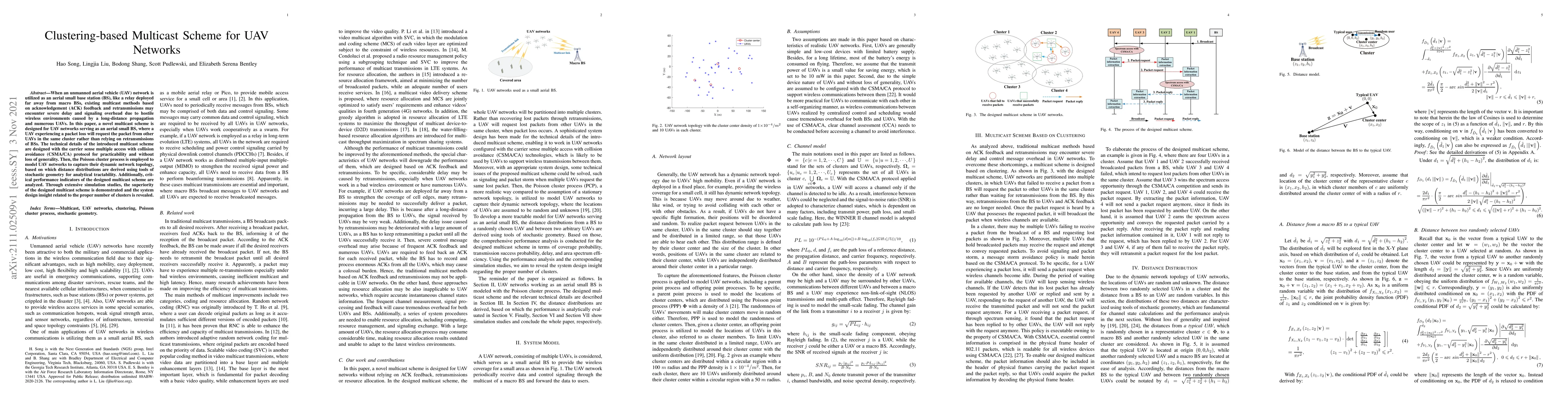 When an unmanned aerial vehicle (UAV) network is utilized as an aerial small base station (BS), like a relay deployed far away from macro BSs, existing multicast methods based on acknowledgement (ACK) feedback and retransmissions may encounter severe delay and signaling overhead due to hostile wireless environments caused by a long-distance propagation and numerous UAVs. In this paper, a novel multicast scheme is designed for UAV networks serving as an aerial small BS, where a UAV experiencing a packet loss will request the packet from other UAVs in the same cluster rather than relying on retransmissions of BSs. The technical details of the introduced multicast scheme are designed with the carrier sense multiple access with collision avoidance (CSMA/CA) protocol for practicability and without loss of generality. Then, the Poisson cluster process is employed to model UAV networks to capture their dynamic network topology, based on which distance distributions are derived using tools of stochastic geometry for analytical tractability. Additionally, critical performance indicators of the designed multicast scheme are analyzed. Through extensive simulation studies, the superiority of the designed multicast scheme is demonstrated and the system design insight related to the proper number of clusters is revealed.
