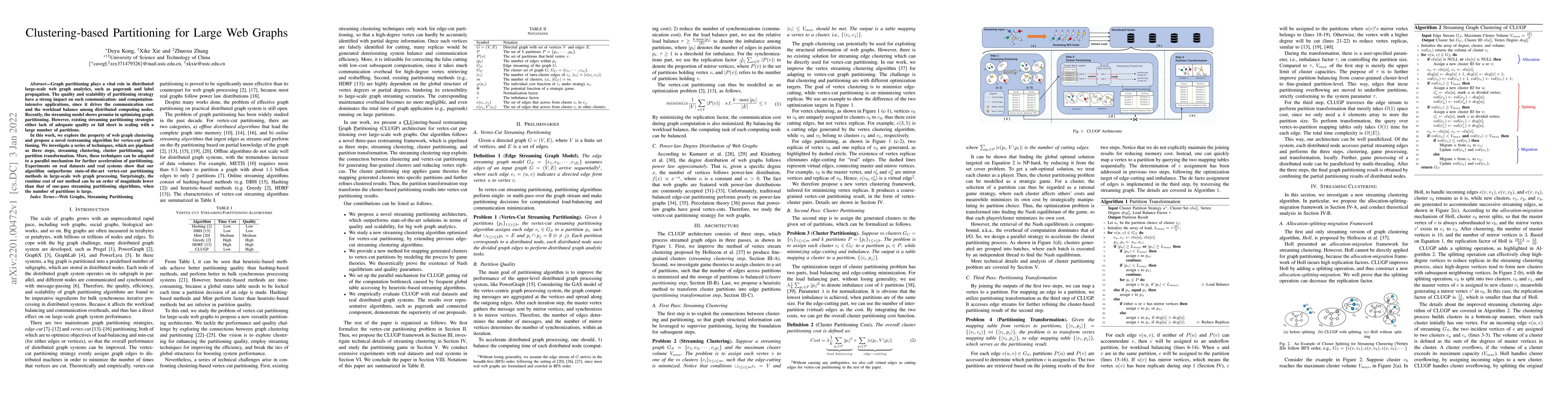 Graph partitioning plays a vital role in distributedlarge-scale web graph analytics, such as pagerank and labelpropagation. The quality and scalability of partitioning strategyhave a strong impact on such communication- and computation-intensive applications, since it drives the communication costand the workload balance among distributed computing nodes.Recently, the streaming model shows promise in optimizing graphpartitioning. However, existing streaming partitioning strategieseither lack of adequate quality or fall short in scaling with alarge number of partitions.In this work, we explore the property of web graph clusteringand propose a novel restreaming algorithm for vertex-cut parti-tioning. We investigate a series of techniques, which are pipelinedas three steps, streaming clustering, cluster partitioning, andpartition transformation. More, these techniques can be adaptedto a parallel mechanism for further acceleration of partitioning.Experiments on real datasets and real systems show that ouralgorithm outperforms state-of-the-art vertex-cut partitioningmethods in large-scale web graph processing. Surprisingly, theruntime cost of our method can be an order of magnitude lowerthan that of one-pass streaming partitioning algorithms, whenthe number of partitions is large.