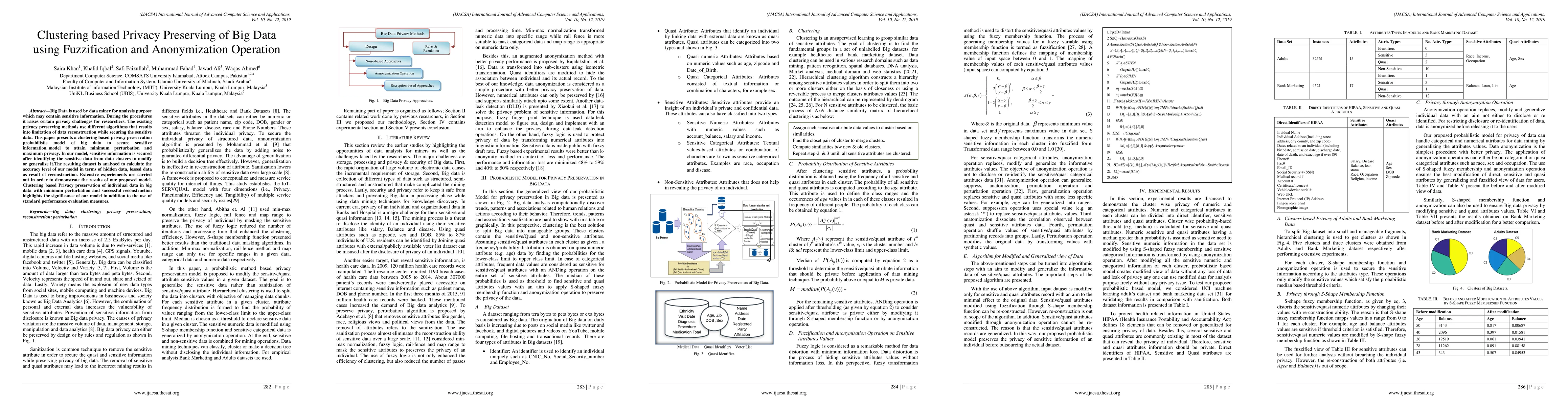 This paper proposes a clustering-based probabilistic model for privacy preservation in big data using fuzzification and anonymization. The model aims to secure sensitive data with minimal perturbation and successful reconstruction, evaluated through extensive experiments and performance measures.