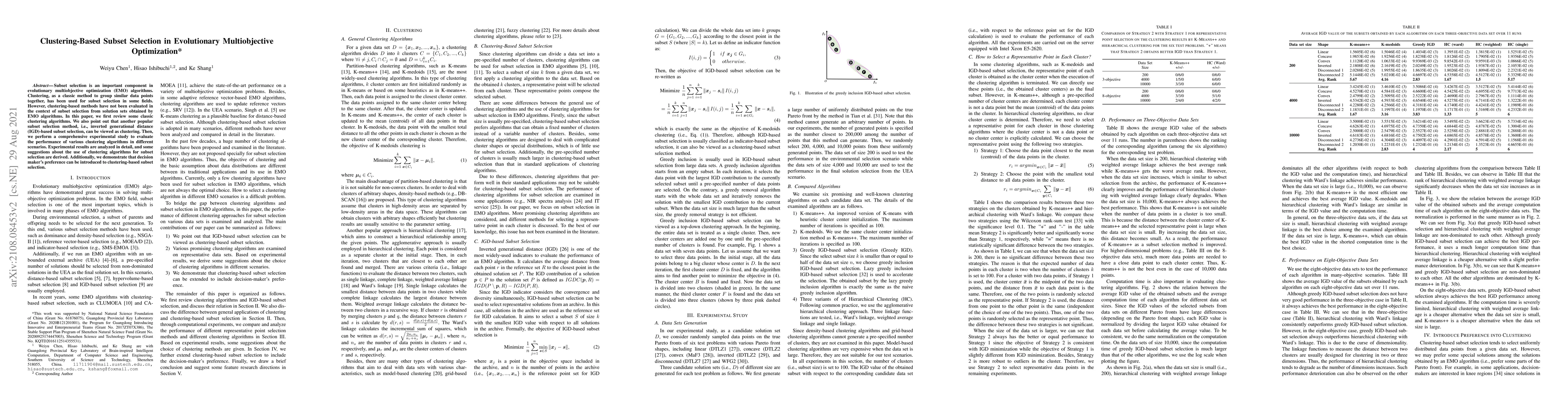 This paper evaluates the effectiveness of clustering algorithms for subset selection in evolutionary multiobjective optimization (EMO) and compares it to inverted generational distance (IGD)-based methods. Through a comprehensive experimental study, it suggests optimal clustering approaches and demonstrates how decision maker's preferences can be incorporated.