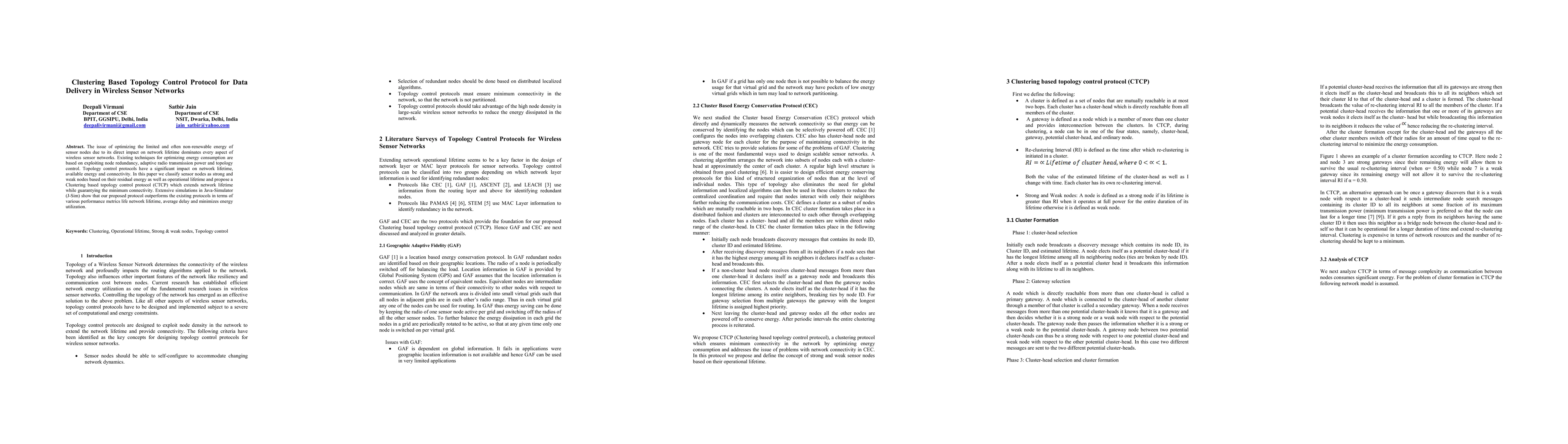 This paper proposes a Clustering based Topology Control Protocol (CTCP) to optimize energy consumption in wireless sensor networks by classifying nodes into strong and weak based on energy and lifetime. Simulations show that CTCP extends network lifetime, reduces average delay, and minimizes energy usage compared to existing protocols.