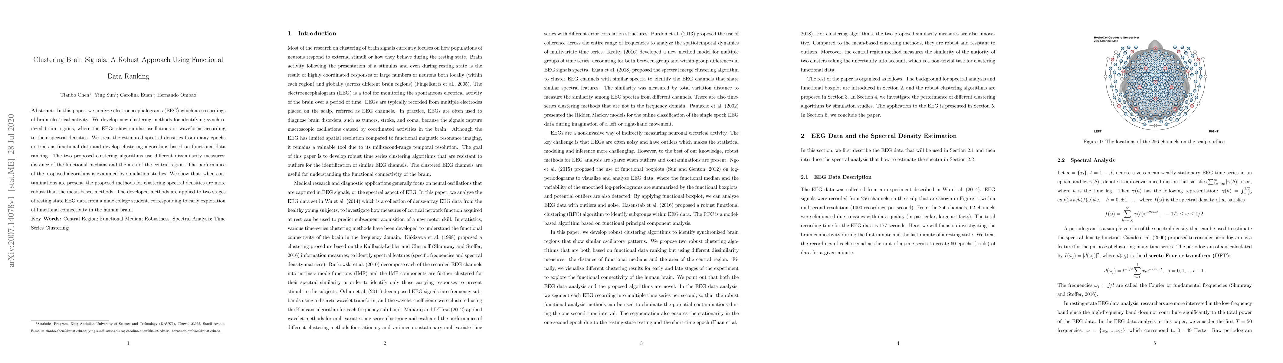 This paper develops new clustering methods for identifying synchronized brain regions using EEG data, treating spectral densities as functional data. The proposed algorithms, based on functional data ranking, outperform mean-based methods in robustness against contaminations, as demonstrated through simulation studies and application to resting state EEG data.