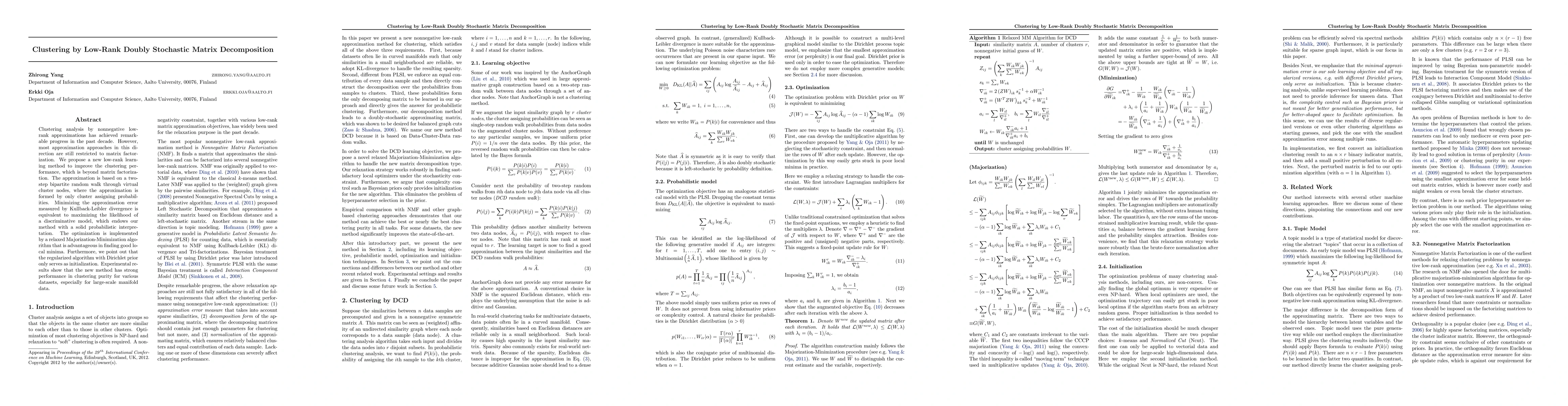 Clustering analysis by nonnegative low-rank approximations has achieved remarkable progress in the past decade. However, most approximation approaches in this direction are still restricted to matrix factorization. We propose a new low-rank learning method to improve the clustering performance, which is beyond matrix factorization. The approximation is based on a two-step bipartite random walk through virtual cluster nodes, where the approximation is formed by only cluster assigning probabilities. Minimizing the approximation error measured by Kullback-Leibler divergence is equivalent to maximizing the likelihood of a discriminative model, which endows our method with a solid probabilistic interpretation. The optimization is implemented by a relaxed Majorization-Minimization algorithm that is advantageous in finding good local minima. Furthermore, we point out that the regularized algorithm with Dirichlet prior only serves as initialization. Experimental results show that the new method has strong performance in clustering purity for various datasets, especially for large-scale manifold data.