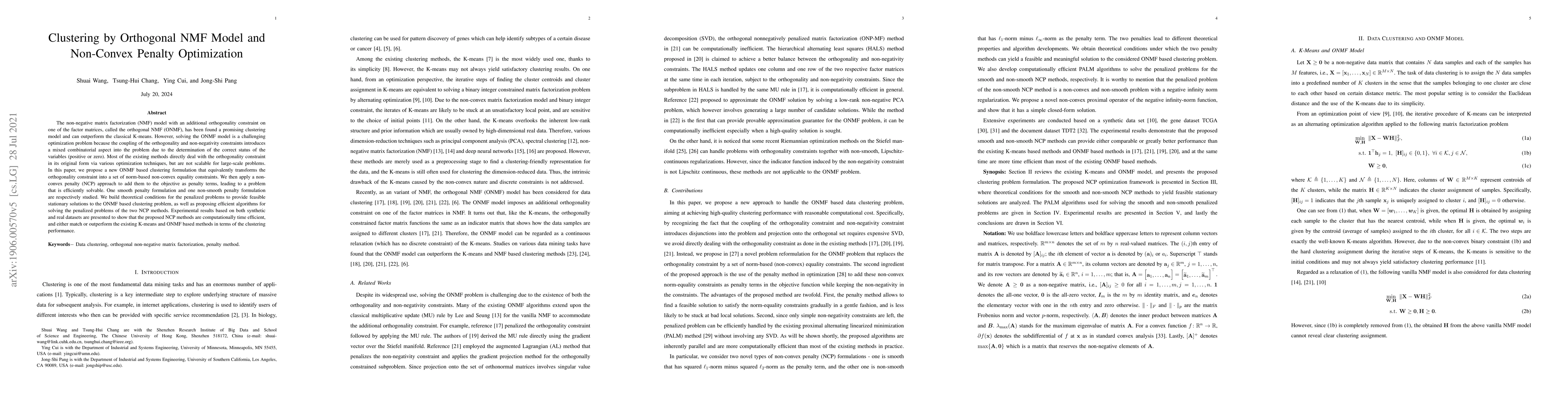 This paper proposes a new non-negative matrix factorization model with orthogonal constraints that can be efficiently solved using non-convex penalty optimization methods, outperforming existing K-means and ONMF-based clustering models in terms of clustering performance.
