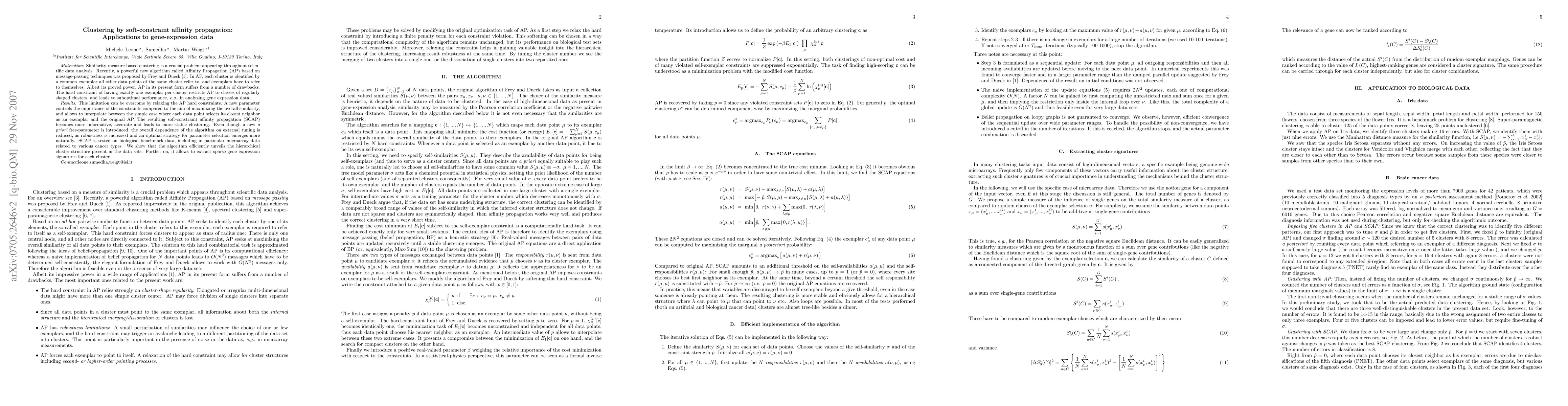 Motivation: Similarity-measure based clustering is a crucial problem appearing throughout scientific data analysis. Recently, a powerful new algorithm called Affinity Propagation (AP) based on message-passing techniques was proposed by Frey and Dueck \cite{Frey07}. In AP, each cluster is identified by a common exemplar all other data points of the same cluster refer to, and exemplars have to refer to themselves. Albeit its proved power, AP in its present form suffers from a number of drawbacks. The hard constraint of having exactly one exemplar per cluster restricts AP to classes of regularly shaped clusters, and leads to suboptimal performance, {\it e.g.}, in analyzing gene expression data. Results: This limitation can be overcome by relaxing the AP hard constraints. A new parameter controls the importance of the constraints compared to the aim of maximizing the overall similarity, and allows to interpolate between the simple case where each data point selects its closest neighbor as an exemplar and the original AP. The resulting soft-constraint affinity propagation (SCAP) becomes more informative, accurate and leads to more stable clustering. Even though a new {\it a priori} free-parameter is introduced, the overall dependence of the algorithm on external tuning is reduced, as robustness is increased and an optimal strategy for parameter selection emerges more naturally. SCAP is tested on biological benchmark data, including in particular microarray data related to various cancer types. We show that the algorithm efficiently unveils the hierarchical cluster structure present in the data sets. Further on, it allows to extract sparse gene expression signatures for each cluster.
