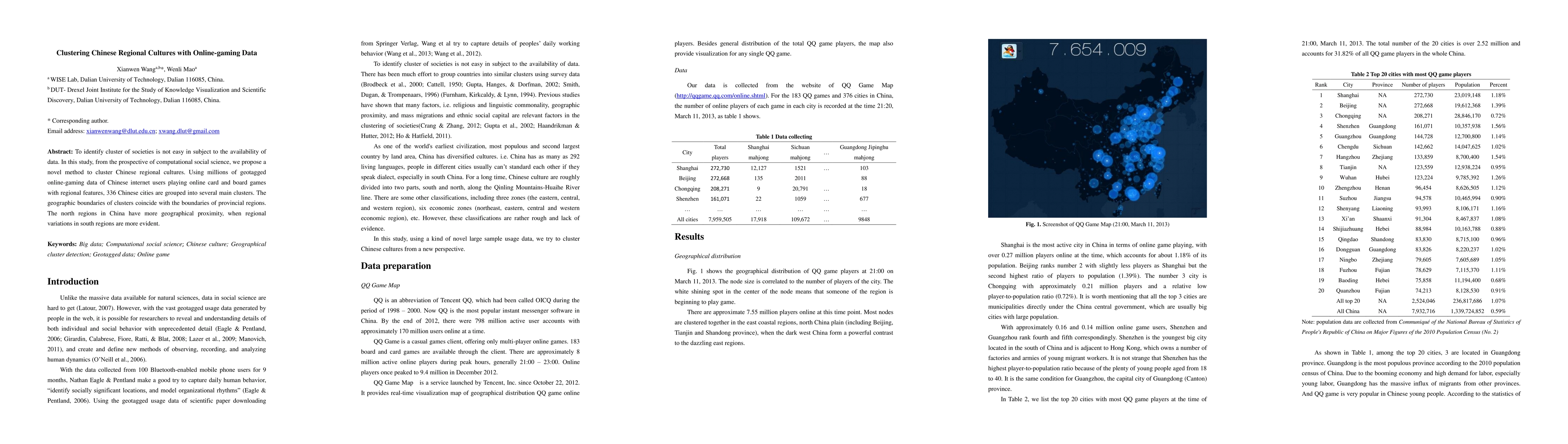 This study proposes a novel computational method to cluster Chinese regional cultures using geotagged online-gaming data. The analysis groups 336 Chinese cities into main clusters, revealing that northern regions exhibit closer cultural ties, while southern regions show more pronounced regional variations.
