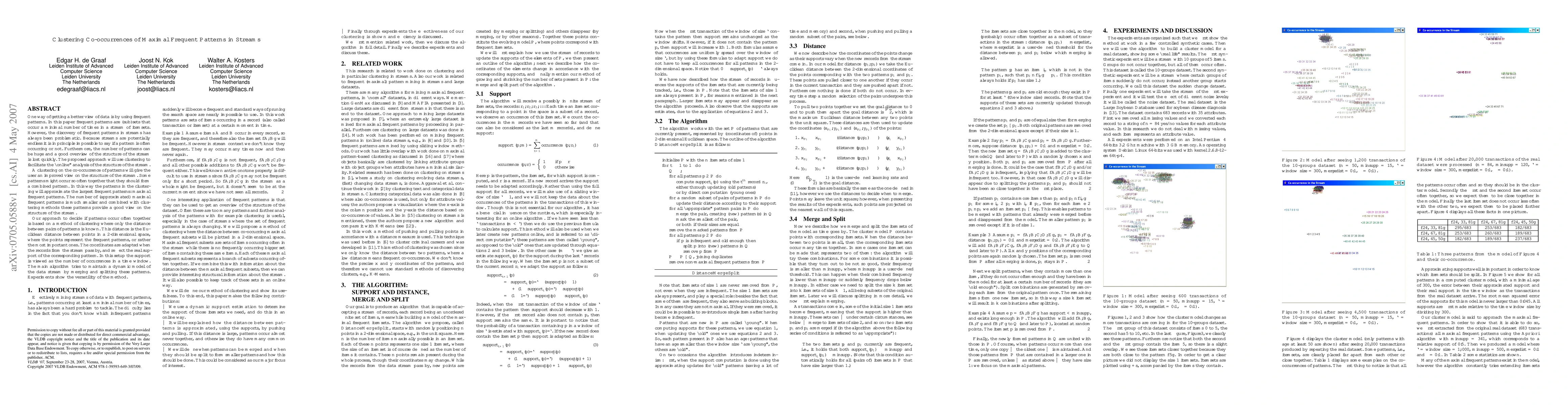 This paper proposes a method to cluster maximal frequent patterns in data streams, addressing the challenge of analyzing potentially endless streams where frequent patterns are difficult to identify. By clustering co-occurrences, it aims to provide a clearer view of the stream's structure, simplifying the analysis of large numbers of patterns.