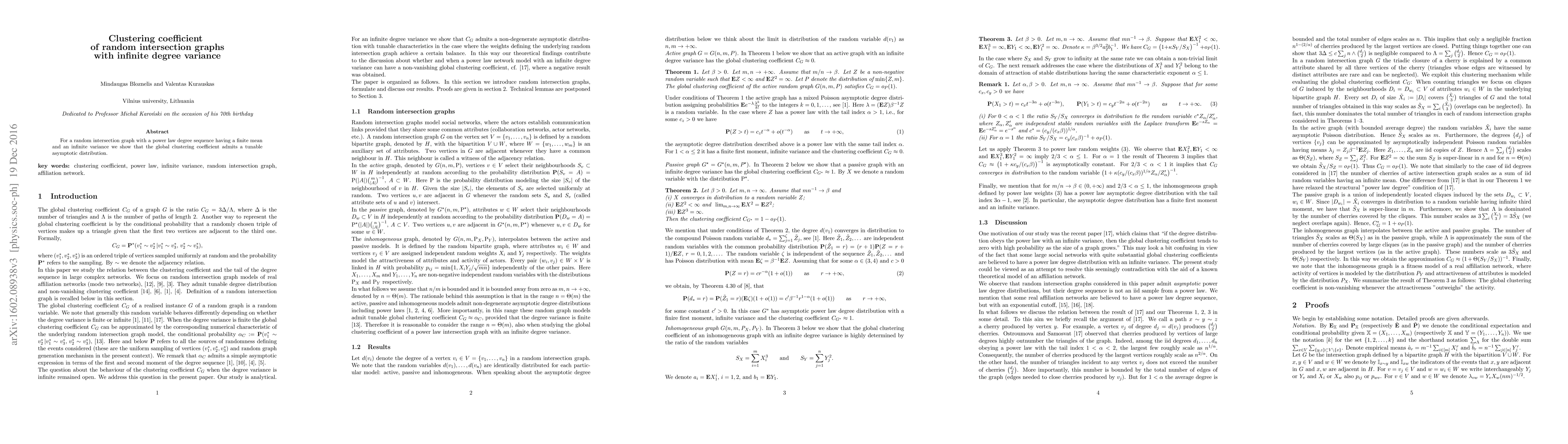 Summary: This paper investigates the clustering coefficient in random intersection graphs with power law degree sequences featuring finite mean but infinite variance. It demonstrates that the global clustering coefficient exhibits a tunable asymptotic distribution.