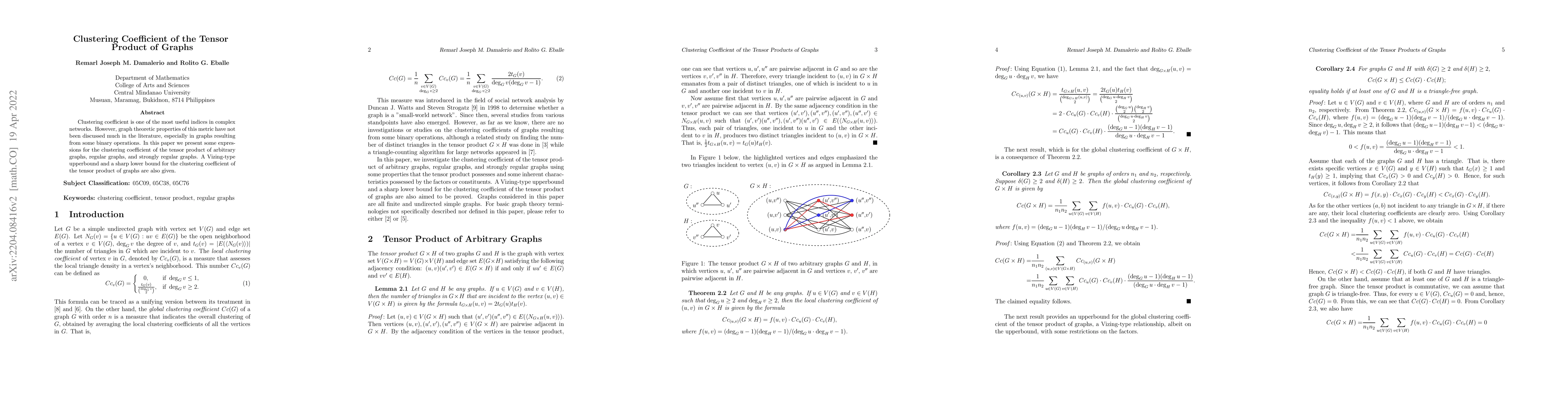 Clustering coefficient is one of the most useful indices in complex networks. However, graph theoretic properties of this metric have not been discussed much in the literature, especially in graphs resulting from some binary operations. In this paper we present some expressions for the clustering coefficient of the tensor product of arbitrary graphs, regular graphs, and strongly regular graphs. A Vizing-type upperbound and a sharp lower bound for the clustering coefficient of the tensor product of graphs are also given.