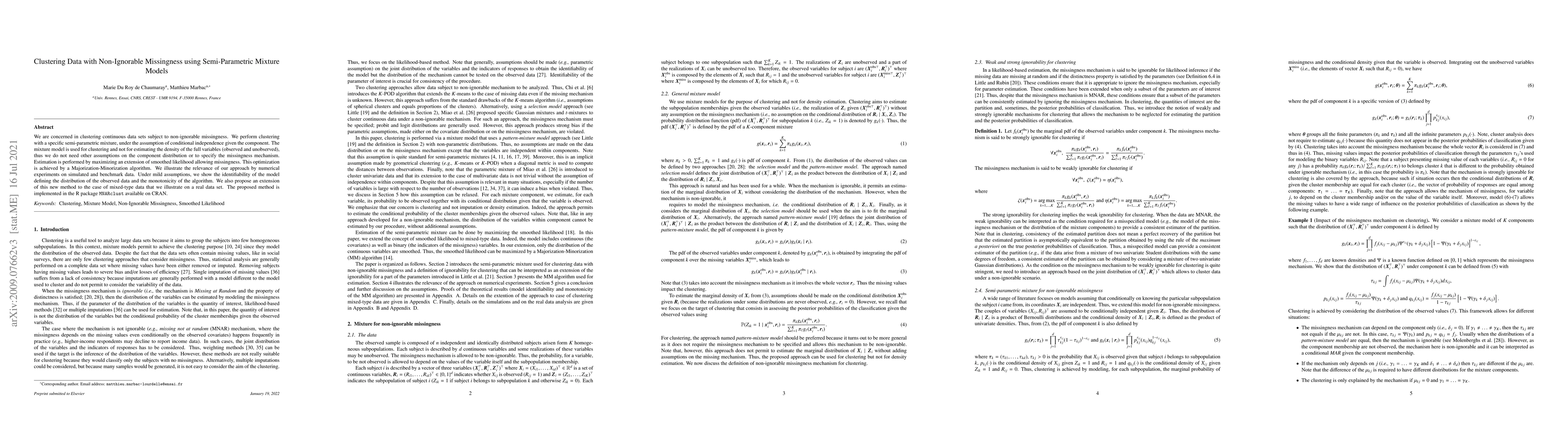 This paper proposes a semi-parametric mixture model for clustering continuous data with non-ignorable missingness, employing a Majorization-Minorization algorithm for estimation. The method demonstrates identifiability and monotonicity, and is extended to mixed-type data, validated through numerical experiments.