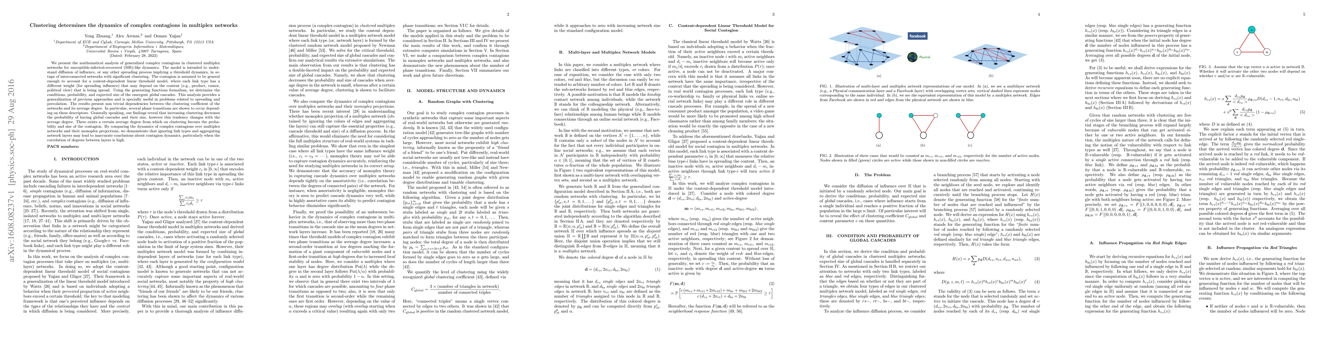This paper analyzes the dynamics of complex contagions in clustered multiplex networks using SIR-like models, revealing that while increased clustering generally reduces the probability and size of global cascades, this effect is modulated by the network's average degree. The study highlights the importance of considering link types and network layers in understanding contagion dynamics, as ignoring these can lead to incorrect conclusions.