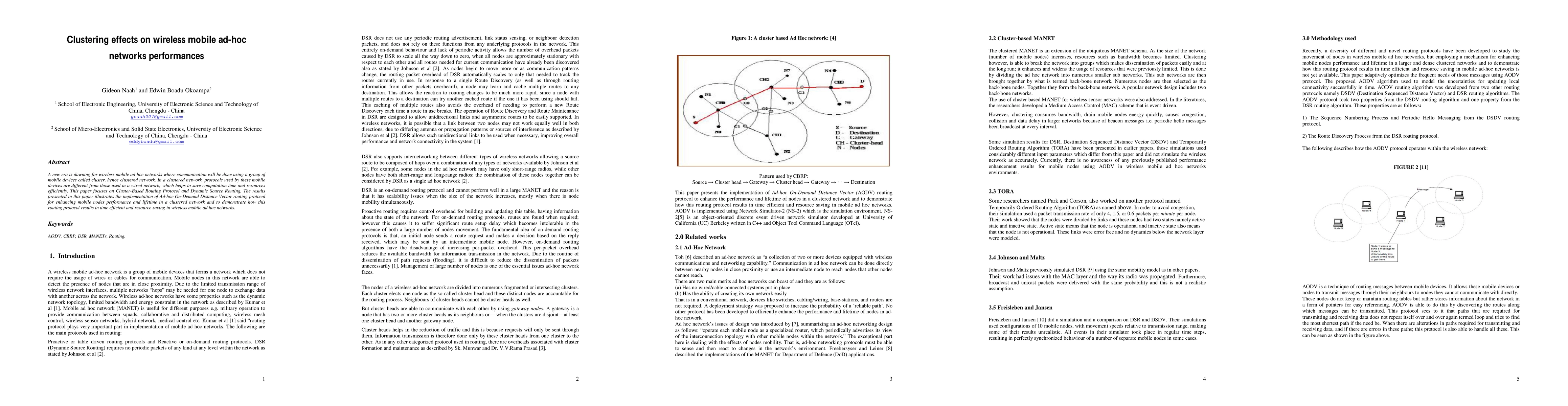 A new era is dawning for wireless mobile ad hoc networks where communication will be done using a group of mobile devices called cluster, hence clustered network. In a clustered network, protocols used by these mobile devices are different from those used in a wired network; which helps to save computation time and resources efficiently. This paper focuses on Cluster-Based Routing Protocol and Dynamic Source Routing. The results presented in this paper illustrates the implementation of Ad-hoc On-Demand Distance Vector routing protocol for enhancing mobile nodes performance and lifetime in a clustered network and to demonstrate how this routing protocol results in time efficient and resource saving in wireless mobile ad hoc networks.