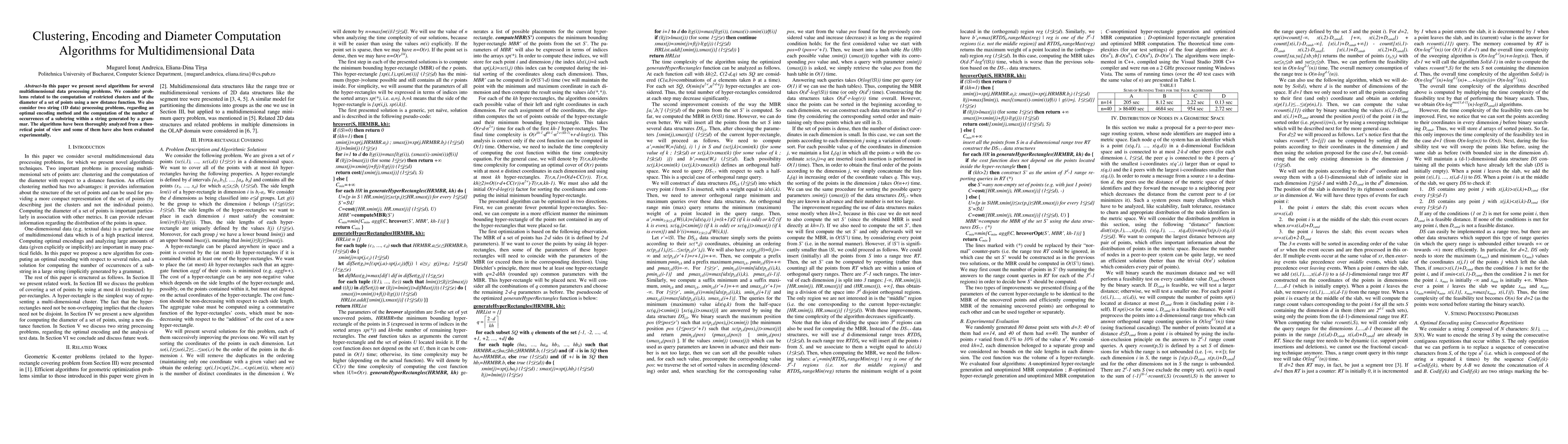 In this paper we present novel algorithms for several multidimensional data processing problems. We consider problems related to the computation of restricted clusters and of the diameter of a set of points using a new distance function. We also consider two string (1D data) processing problems, regarding an optimal encoding method and the computation of the number of occurrences of a substring within a string generated by a grammar. The algorithms have been thoroughly analyzed from a theoretical point of view and some of them have also been evaluated experimentally.