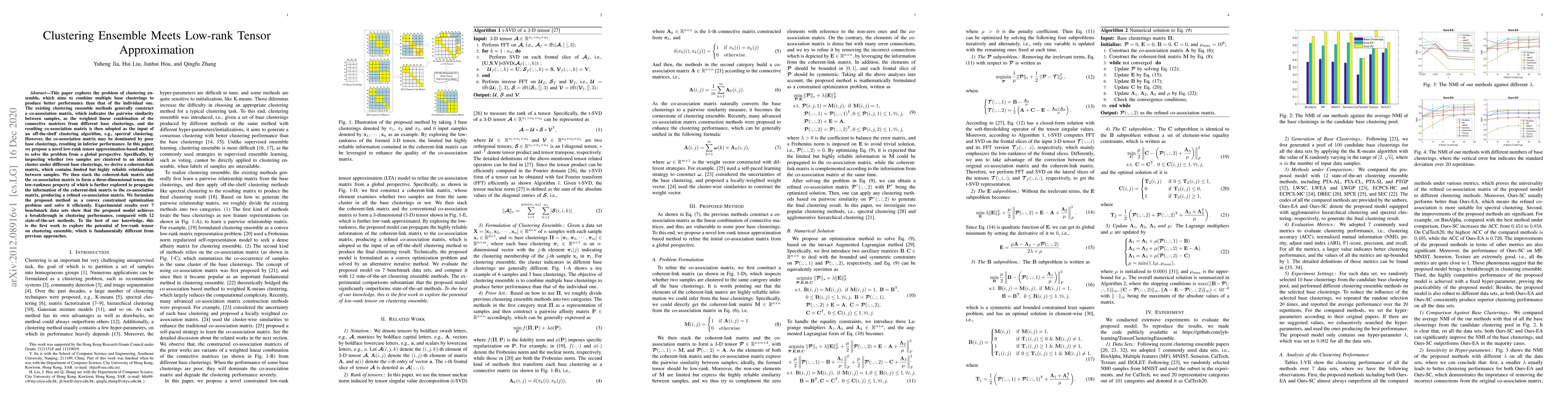 This paper introduces a novel low-rank tensor approximation-based method for clustering ensemble, aiming to improve performance by combining multiple base clusterings. The proposed method constructs a refined co-association matrix by leveraging a coherent-link matrix, which captures highly reliable relationships, and achieves superior clustering results on benchmark datasets compared to state-of-the-art methods.
