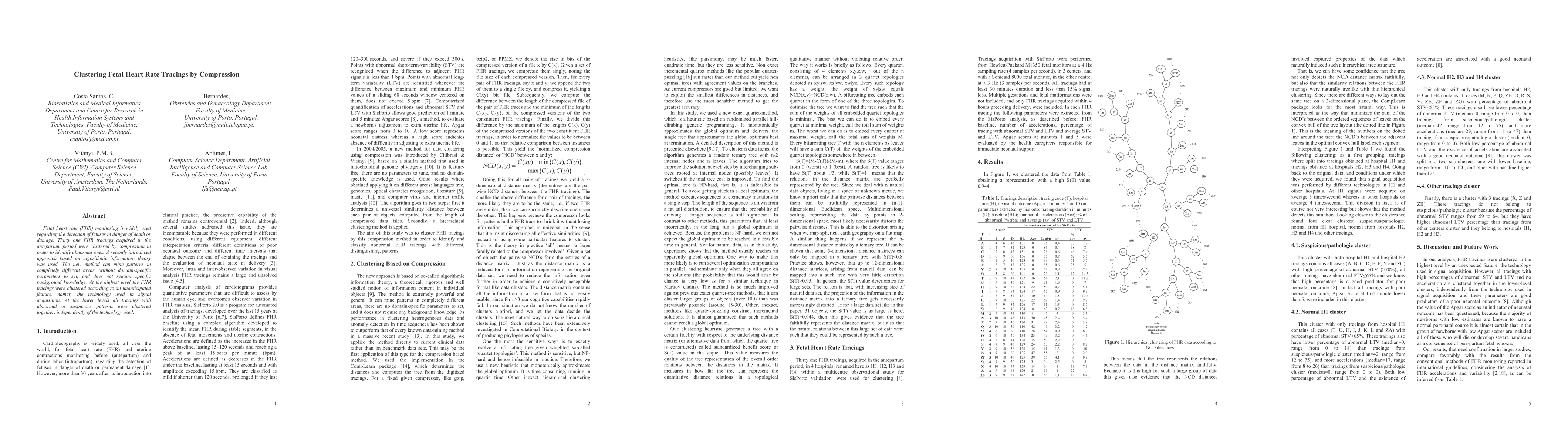 Fetal heart rate (FHR) monitoring, before and during labor, is a very important medical practice in the detection of fetuses in danger. We clustered FHR tracings by compression in order to identify abnormal ones. We use a recently introduced approach based on algorithmic information theory, a theoretical, rigorous and well-studied notion of information content in individual objects. The new method can mine patterns in completely different areas, there are no domain-specific parameters to set, and it does not require specific background knowledge. At the highest level the FHR tracings were clustered according to an unanticipated feature, namely the technology used in signal acquisition. At the lower levels all tracings with abnormal or suspicious patterns were clustered together, independent of the technology used. Moreover, FHR tracings with future poor neonatal outcomes were included in the cluster with other suspicious patterns.