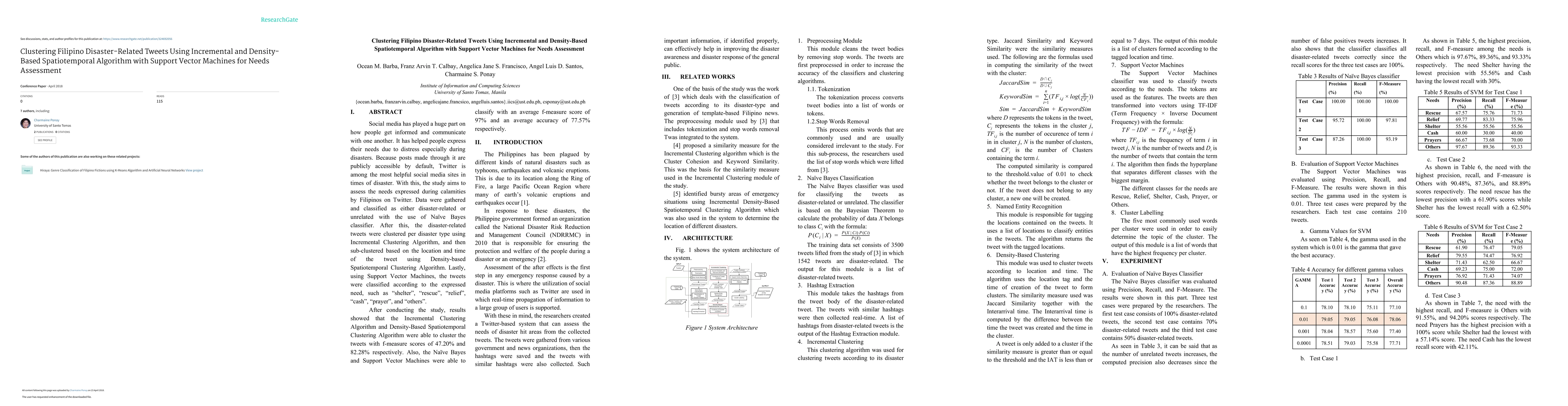 This study clusters Filipino disaster-related tweets using an Incremental Clustering Algorithm and Density-Based Spatiotemporal Clustering Algorithm, followed by Support Vector Machines for needs assessment. The results show effective clustering and classification with f-measure scores of 47.20%, 82.28%, and 97%, and an accuracy of 77.57%.