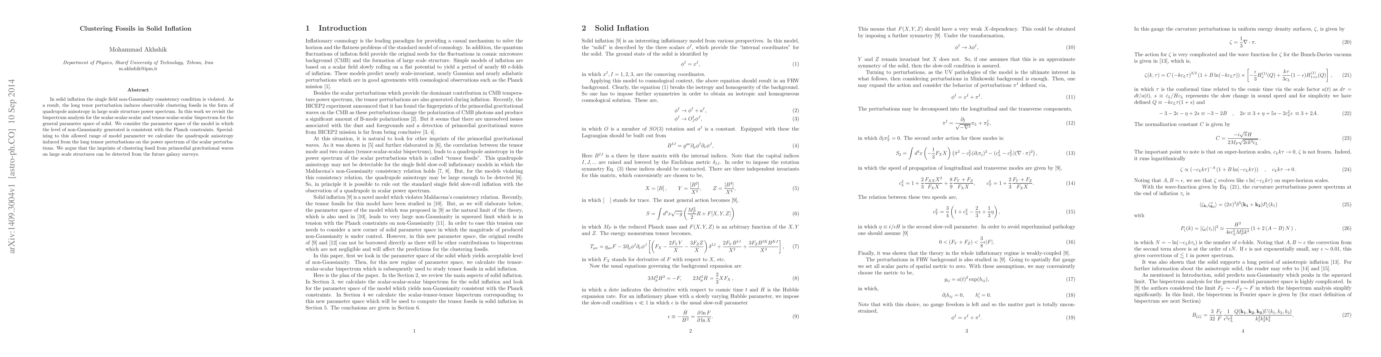 This paper examines the clustering fossils in the form of quadrupole anisotropy in large scale structures due to long tensor perturbations in solid inflation, where single field non-Gaussianity consistency is violated. The study analyzes the bispectrum for scalar and tensor interactions, focusing on parameter ranges consistent with Planck constraints, and suggests that future galaxy surveys may detect these imprints.