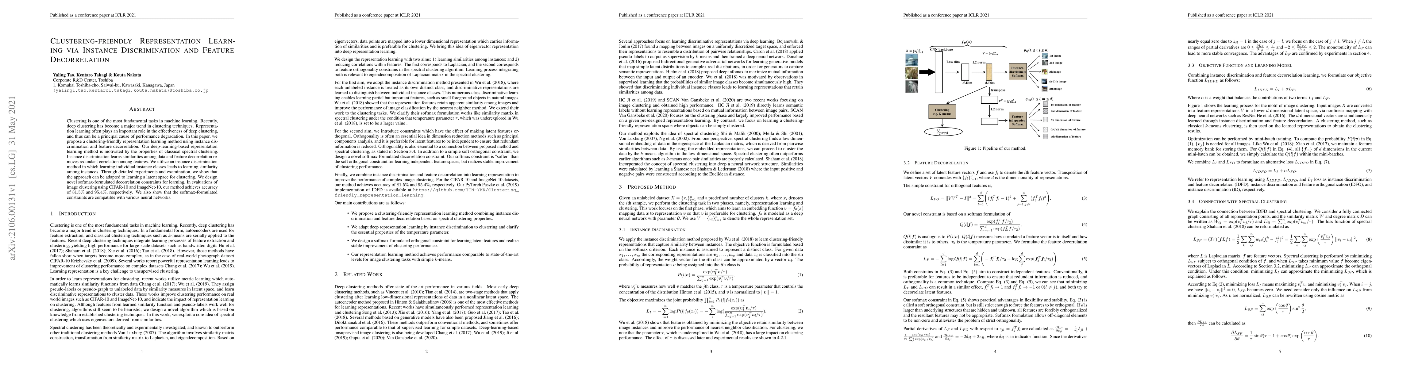 This paper proposes a clustering-friendly representation learning method using instance discrimination and feature decorrelation to enhance deep clustering. The method achieves high accuracy in image clustering tasks on CIFAR-10 and ImageNet-10 datasets, demonstrating its effectiveness and compatibility with various neural networks.