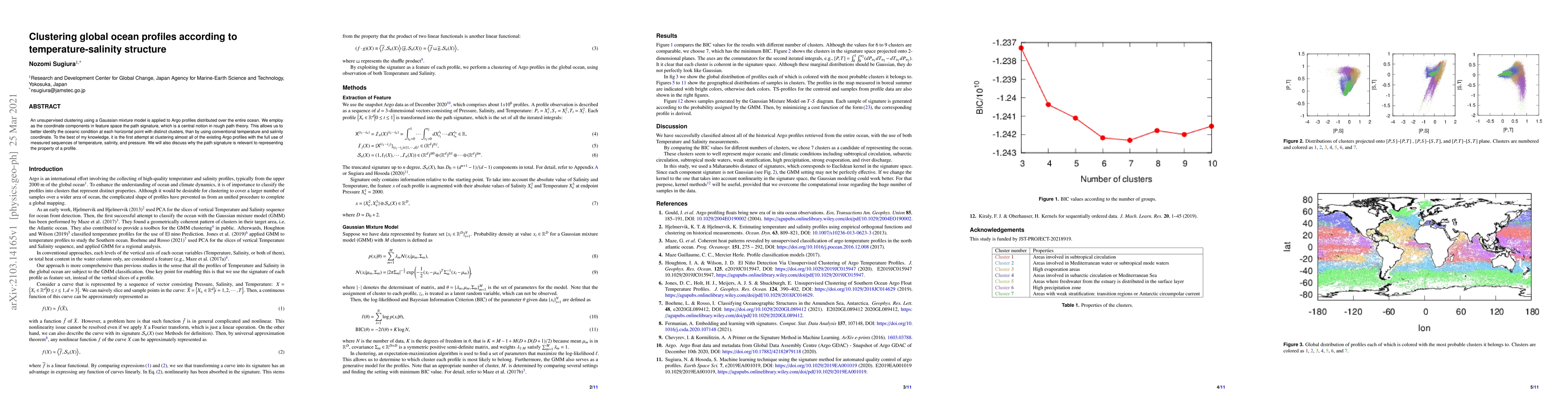 Researchers used a Gaussian mixture model to cluster Argo ocean profiles based on their temperature-salinity structure, revealing distinct clusters with improved accuracy compared to traditional methods. This new approach utilizes the path signature, a concept from rough path theory, to better represent oceanic conditions at each point.