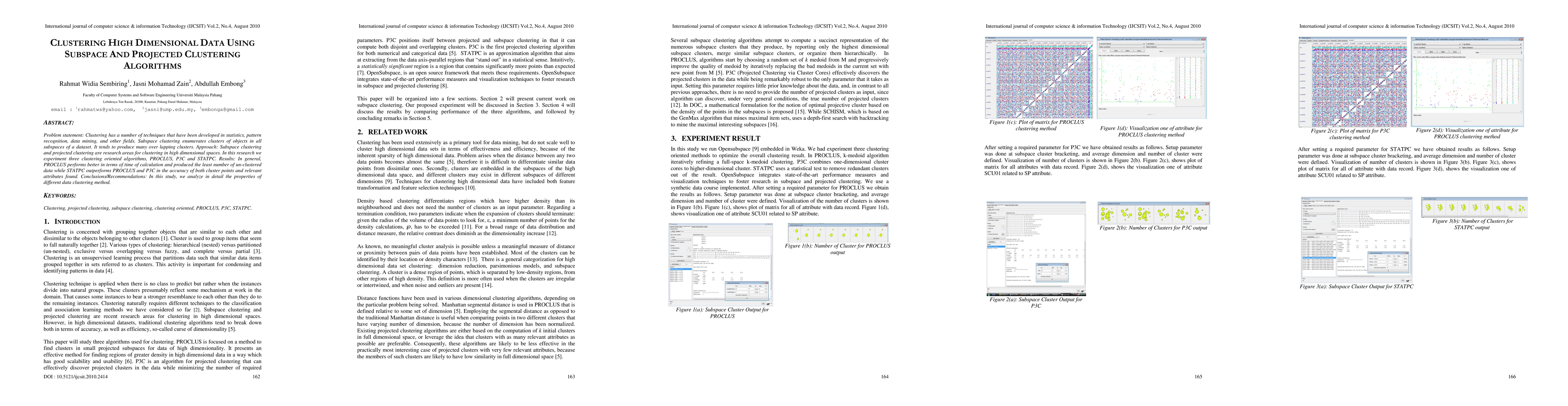 This paper evaluates three high-dimensional clustering algorithms—PROCLUS, P3C, and STATPC—focusing on subspace and projected clustering. The study finds that PROCLUS is faster and produces fewer un-clustered data, while STATPC excels in accuracy of cluster points and relevant attributes.