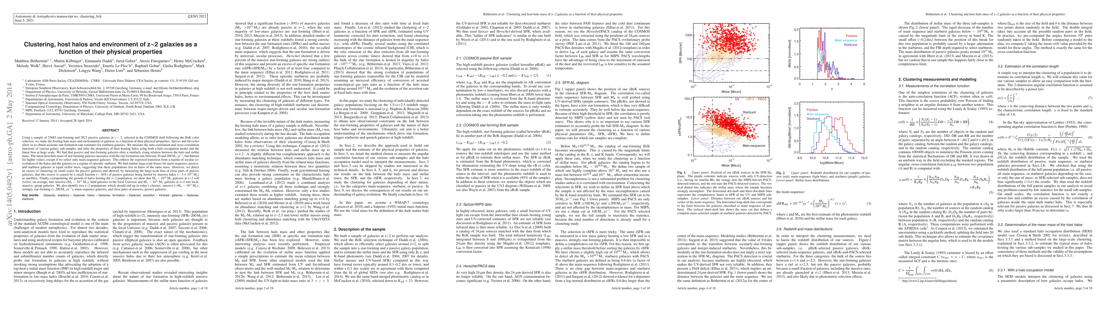 Using a sample of 25683 star-forming and 2821 passive galaxies at $z\sim2$, selected in the COSMOS field following the BzK color criterion, we study the hosting halo mass and environment of galaxies as a function of their physical properties. Spitzer and Herschel provide accurate SFR estimates for starburst galaxies. We measure the auto- and cross-correlation functions of various galaxy sub-samples and infer the properties of their hosting halos using both an HOD model and the linear bias at large scale. We find that passive and star-forming galaxies obey a similarly rising relation between the halo and stellar mass. The mean host halo mass of star forming galaxies increases with the star formation rate between 30 and 200 M$_\odot$.yr$^{-1}$, but flattens for higher values, except if we select only main-sequence galaxies. This reflects the expected transition from a regime of secular co-evolution of the halos and the galaxies to a regime of episodic starburst. We find similar large scale biases for main-sequence, passive, and starburst galaxies at equal stellar mass, suggesting that these populations live in halos of the same mass. We detect an excess of clustering on small scales for passive galaxies and showed, by measuring the large-scale bias of close pairs, that this excess is caused by a small fraction ($\sim16%$) of passive galaxies being hosted by massive halos ($\sim 3 \times 10^{13}$ M$_\odot$) as satellites. Finally, extrapolating the growth of halos hosting the z$\sim$2 population, we show that M$_\star \sim 10^{10}$ M$_\odot$ galaxies at z$\sim$2 will evolve, on average, into massive (M$_\star \sim 10^{11}$ M$_\odot$), field galaxies in the local Universe and M$_\star \sim 10^{11}$ M$_\odot$ galaxies at z=2 into local, massive, group galaxies. The most massive main-sequence galaxies and close pairs of massive, passive galaxies end up in today's clusters.