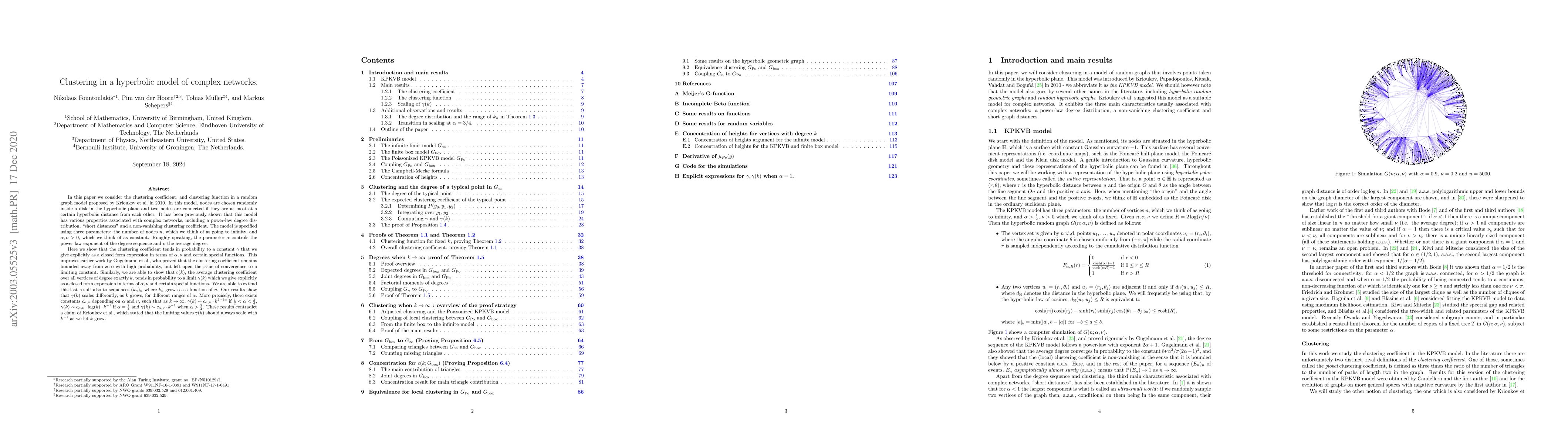 This paper examines clustering in a hyperbolic random graph model, finding that the clustering coefficient converges to a constant γ expressed in terms of model parameters α and ν. It also shows that the average clustering coefficient c(k) for vertices of degree k tends to a limit γ(k), also expressed in terms of α and ν, scaling differently for various α ranges. These findings contradict a previous claim by Krioukov et al.