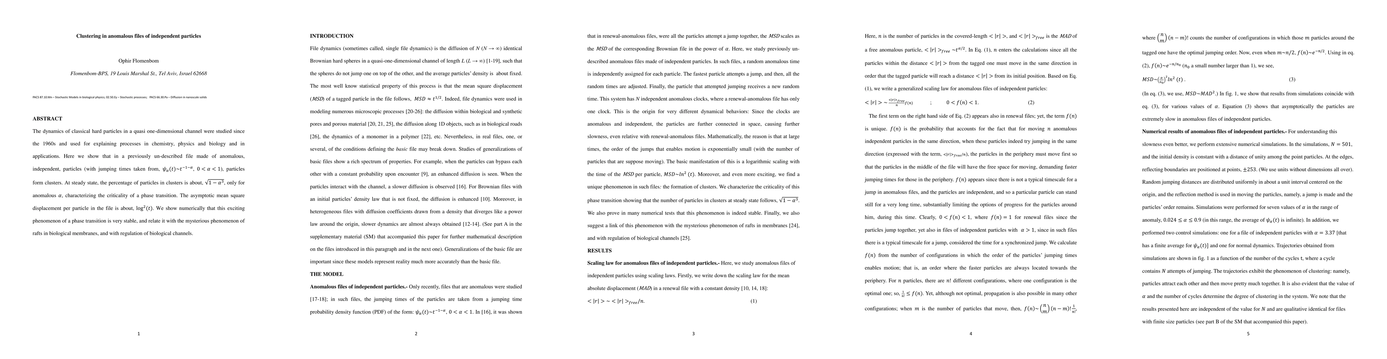 Particles in a file of anomalous, independent particles form clusters at steady state, with the percentage of particles in clusters determined by the parameter { heta} (√(1-{ heta}^3)), indicating a phase transition. This phenomenon is stable and relates to biological membranes and channel regulation.