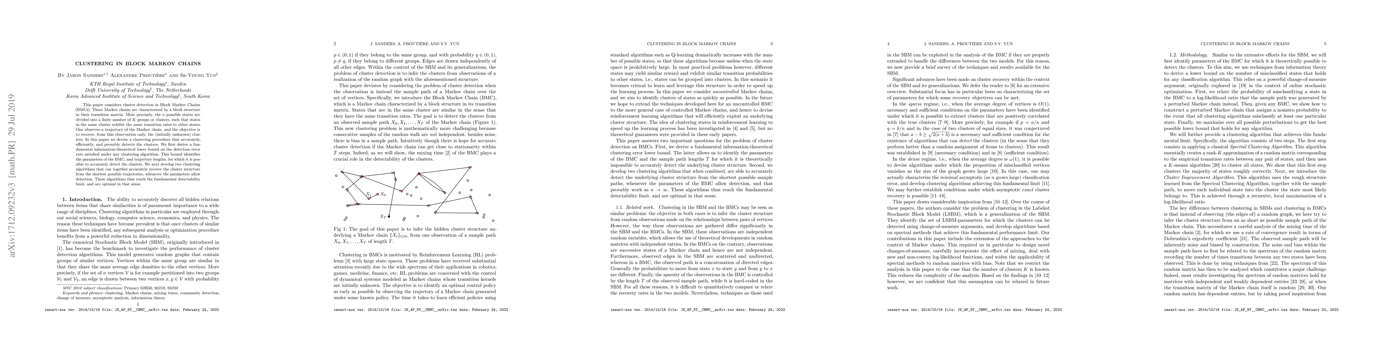 This paper considers cluster detection in Block Markov Chains (BMCs). These Markov chains are characterized by a block structure in their transition matrix. More precisely, the $n$ possible states are divided into a finite number of $K$ groups or clusters, such that states in the same cluster exhibit the same transition rates to other states. One observes a trajectory of the Markov chain, and the objective is to recover, from this observation only, the (initially unknown) clusters. In this paper we devise a clustering procedure that accurately, efficiently, and provably detects the clusters. We first derive a fundamental information-theoretical lower bound on the detection error rate satisfied under any clustering algorithm. This bound identifies the parameters of the BMC, and trajectory lengths, for which it is possible to accurately detect the clusters. We next develop two clustering algorithms that can together accurately recover the cluster structure from the shortest possible trajectories, whenever the parameters allow detection. These algorithms thus reach the fundamental detectability limit, and are optimal in that sense.