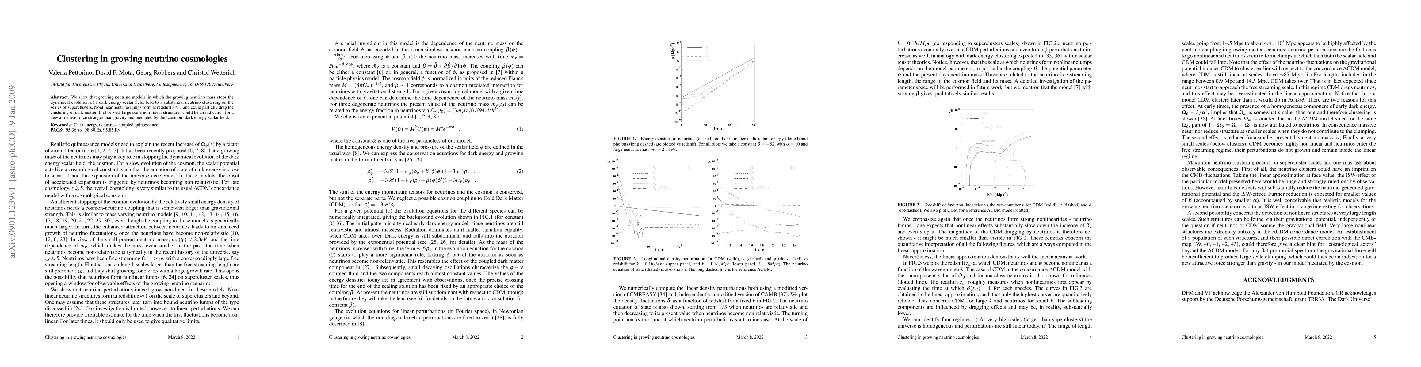 We show that growing neutrino models, in which the growing neutrino mass stops the dynamical evolution of a dark energy scalar field, lead to a substantial neutrino clustering on the scales of superclusters. Nonlinear neutrino lumps form at redshift z ~ 1 and could partially drag the clustering of dark matter. If observed, large scale non-linear structures could be an indication for a new attractive force stronger than gravity and mediated by the 'cosmon' dark energy scalar field.