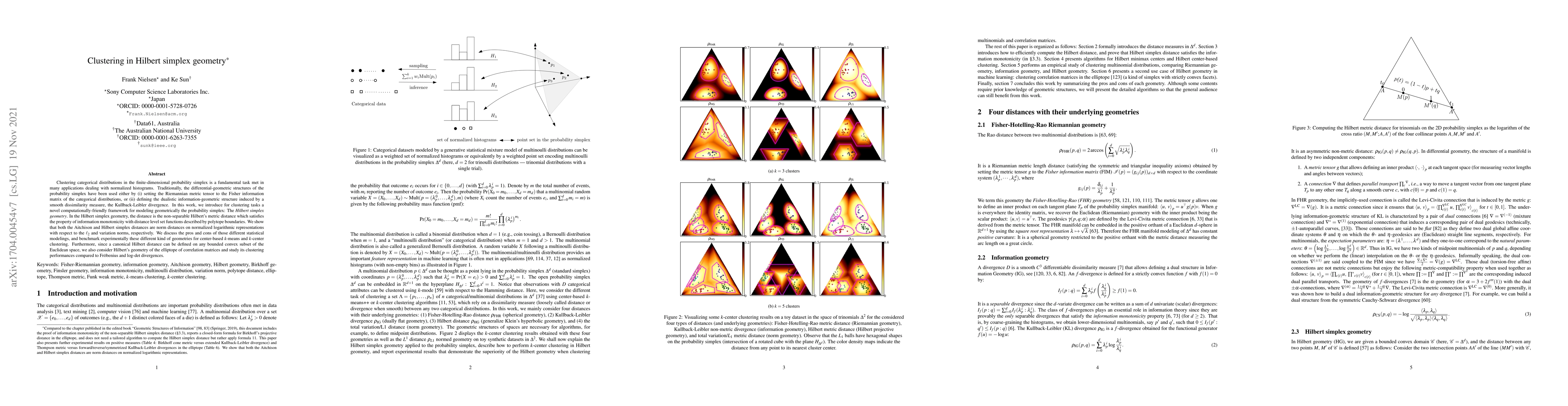 This paper introduces a novel Hilbert simplex geometry for clustering categorical distributions, contrasting it with traditional Fisher information matrix and Kullback-Leibler divergence approaches. The Hilbert simplex geometry employs the non-separable Hilbert's metric, which maintains information monotonicity, and is benchmarked against other methods for $k$-means and $k$-center clustering.