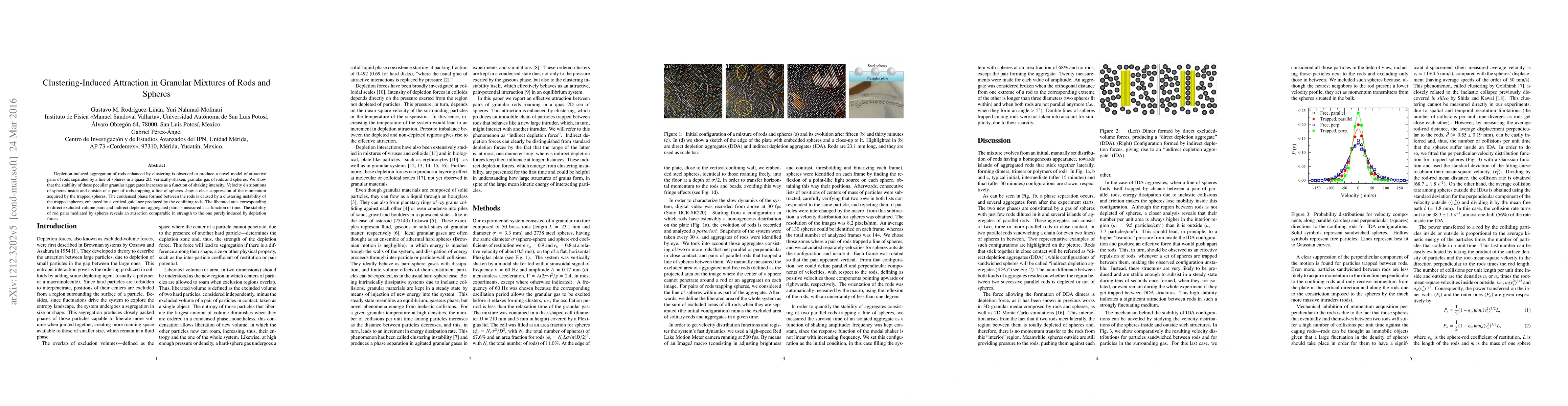 Depletion-induced aggregation of rods enhanced by clustering is observed to produce a novel model of attractive pairs of rods separated by a line of spheres in a quasi-2D, vertically-shaken, granular gas of rods and spheres. We show that the stability of these peculiar granular aggregates increases as a function of shaking intensity. Velocity distributions of spheres inside and outside of a pair of rods trapping a line of spheres show a clear suppression of the momentum acquired by the trapped spheres. The condensed phase formed between the rods is caused by a clustering instability of the trapped spheres, enhanced by a vertical guidance produced by the confining rods. The liberated area corresponding to direct excluded-volume pairs and indirect depletion-aggregated pairs is measured as a function of time. The stability of rod pairs mediated by spheres reveals an attraction comparable in strength to the one purely induced by depletion forces.