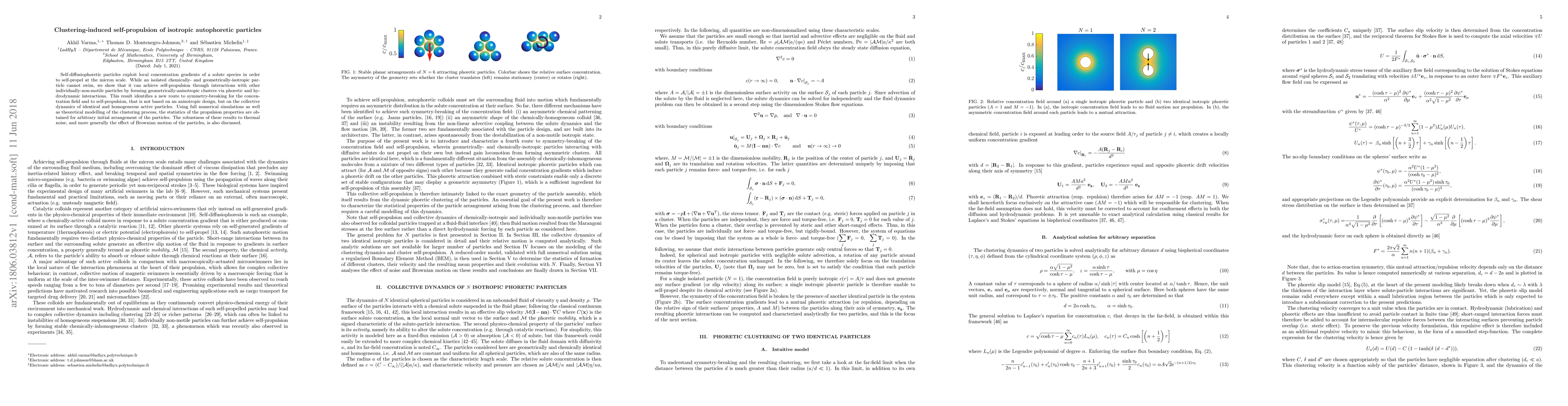 This paper demonstrates that isotropic autophoretic particles can achieve self-propulsion by clustering through phoretic and hydrodynamic interactions, breaking symmetry without anisotropic design. Numerical simulations and theoretical modeling reveal the statistical properties of this collective motion, and the robustness of these findings under thermal noise is discussed.