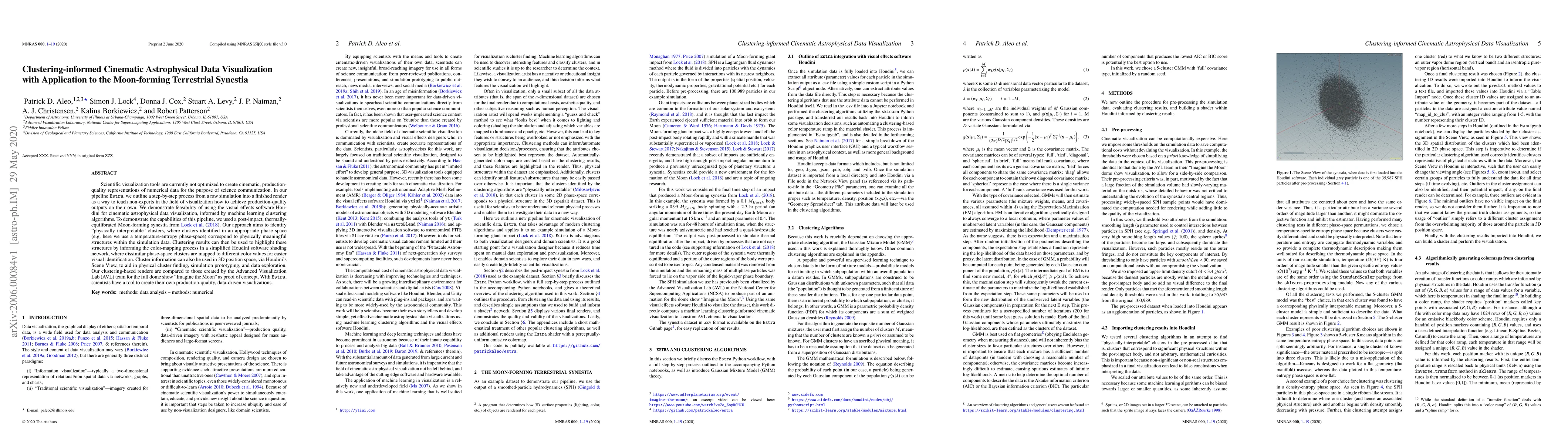 Scientific visualization tools are currently not optimized to create cinematic, production-quality representations of numerical data for the purpose of science communication. In our pipeline \texttt{Estra}, we outline a step-by-step process from a raw simulation into a finished render as a way to teach non-experts in the field of visualization how to achieve production-quality outputs on their own. We demonstrate feasibility of using the visual effects software Houdini for cinematic astrophysical data visualization, informed by machine learning clustering algorithms. To demonstrate the capabilities of this pipeline, we used a post-impact, thermally-equilibrated Moon-forming synestia from \cite{Lock18}. Our approach aims to identify "physically interpretable" clusters, where clusters identified in an appropriate phase space (e.g. here we use a temperature-entropy phase-space) correspond to physically meaningful structures within the simulation data. Clustering results can then be used to highlight these structures by informing the color-mapping process in a simplified Houdini software shading network, where dissimilar phase-space clusters are mapped to different color values for easier visual identification. Cluster information can also be used in 3D position space, via Houdini's Scene View, to aid in physical cluster finding, simulation prototyping, and data exploration. Our clustering-based renders are compared to those created by the Advanced Visualization Lab (AVL) team for the full dome show "Imagine the Moon" as proof of concept. With \texttt{Estra}, scientists have a tool to create their own production-quality, data-driven visualizations.