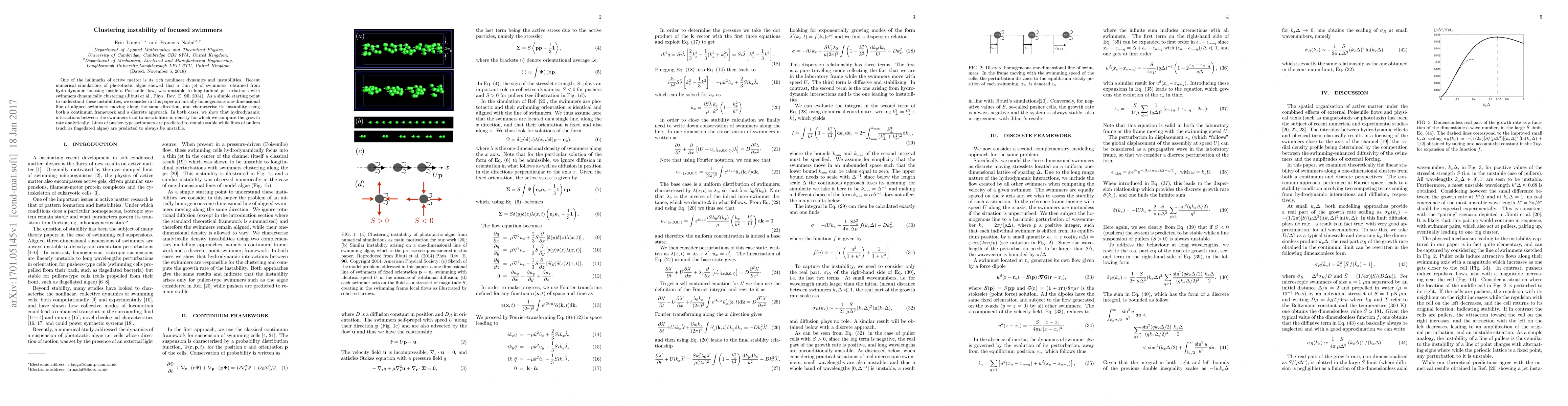 One of the hallmarks of active matter is its rich nonlinear dynamics and instabilities. Recent numerical simulations of phototactic algae showed that a thin jet of swimmers, obtained from hydrodynamic focusing inside a Poiseuille flow, was unstable to longitudinal perturbations with swimmers dynamically clustering (Jibuti et al., Phys. Rev. E, 90, 2014). As a simple starting point to understand these instabilities, we consider in this paper an initially homogeneous one-dimensional line of aligned swimmers moving along the same direction, and characterise its instability using both a continuum framework and a discrete approach. In both cases, we show that hydrodynamic interactions between the swimmers lead to instabilities in density for which we compute the growth rate analytically. Lines of pusher-type swimmers are predicted to remain stable while lines of pullers (such as flagellated algae) are predicted to always be unstable.