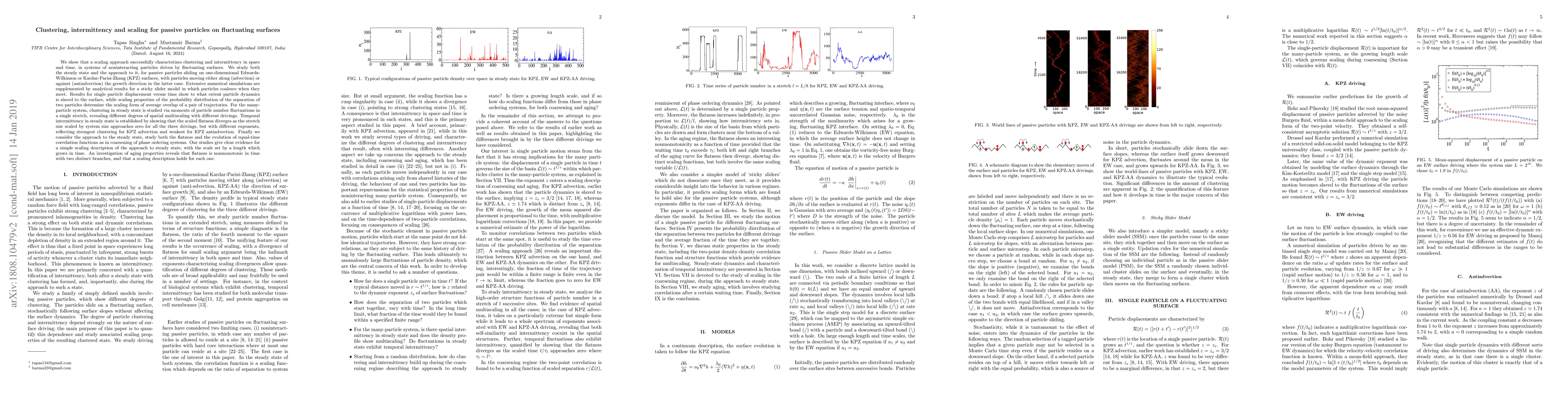 We show that a scaling approach successfully characterizes clustering and intermittency in space and time, in systems of noninteracting particles driven by fluctuating surfaces. We study both the steady state and the approach to it, for passive particles sliding on one-dimensional Edwards-Wilkinson or Kardar-Parisi-Zhang surfaces, with particles moving either along or against the growth direction in the latter case. Extensive numerical simulations are supplemented by analytical results for a sticky slider model in which particles coalesce when they meet. Results for single particle displacement versus time show to what extent particle dynamics is slaved to the surface, while scaling properties of the probability distribution of the separation of two particles have important implications for replica symmetry breaking for a pair of trajectories. For the many-particle system, clustering in steady state is studied via moments of particle number fluctuations in a single stretch, revealing different degrees of spatial multiscaling with different driving. Temporal intermittency in steady state is established by showing that the scaled flatness diverges. Finally we consider the approach to the steady state, and study both the flatness and the evolution of equal-time correlation functions, as in coarsening of phase ordering systems. Our studies give clear evidence for a simple scaling description of the approach to steady state, with a diverging length scale. An investigation of aging properties reveals that flatness is nonmonotonic in time with two distinct branches, and that a scaling description holds for each one.