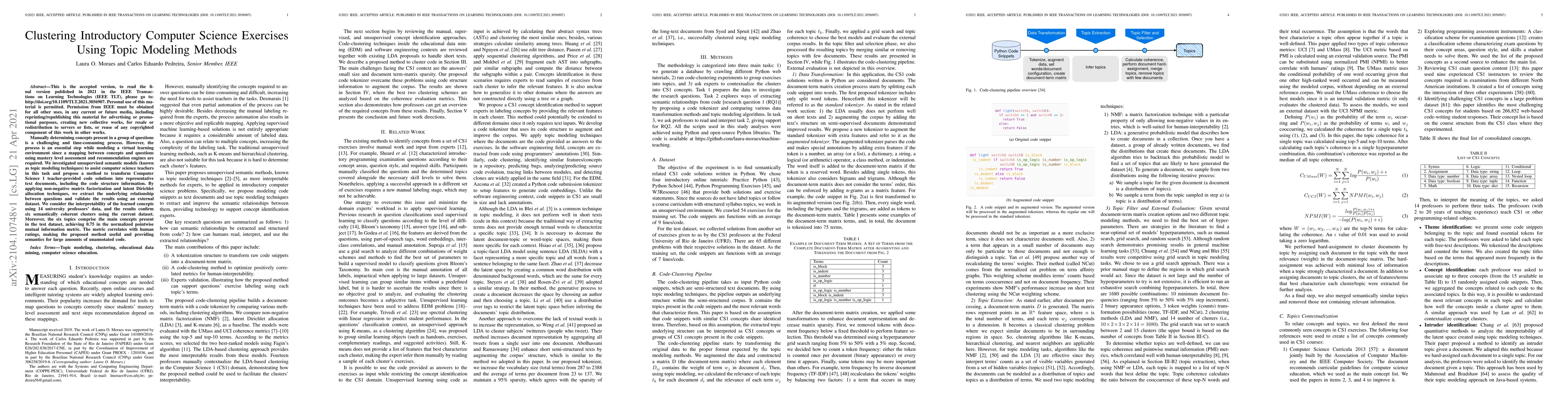 This paper explores the use of topic modeling techniques to cluster introductory computer science exercises, transforming code solutions into text documents to reveal underlying concepts. The study applies non-negative matrix factorization and latent Dirichlet allocation, achieving six semantically coherent clusters validated by university professors, with a normalized pointwise mutual information metric of 0.75.