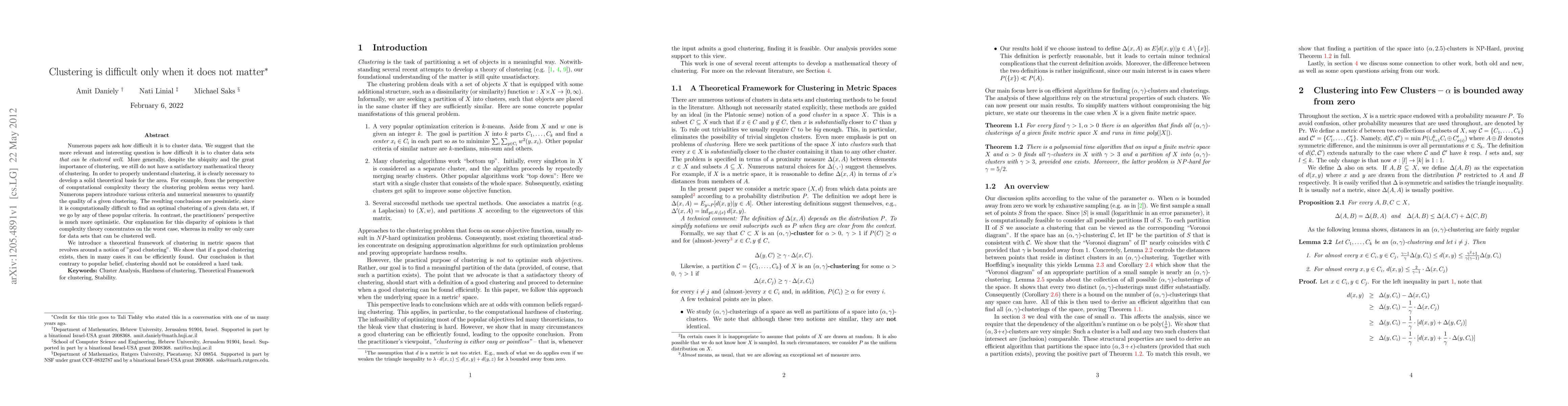Numerous papers ask how difficult it is to cluster data. We suggest that the more relevant and interesting question is how difficult it is to cluster data sets {\em that can be clustered well}. More generally, despite the ubiquity and the great importance of clustering, we still do not have a satisfactory mathematical theory of clustering. In order to properly understand clustering, it is clearly necessary to develop a solid theoretical basis for the area. For example, from the perspective of computational complexity theory the clustering problem seems very hard. Numerous papers introduce various criteria and numerical measures to quantify the quality of a given clustering. The resulting conclusions are pessimistic, since it is computationally difficult to find an optimal clustering of a given data set, if we go by any of these popular criteria. In contrast, the practitioners' perspective is much more optimistic. Our explanation for this disparity of opinions is that complexity theory concentrates on the worst case, whereas in reality we only care for data sets that can be clustered well. We introduce a theoretical framework of clustering in metric spaces that revolves around a notion of "good clustering". We show that if a good clustering exists, then in many cases it can be efficiently found. Our conclusion is that contrary to popular belief, clustering should not be considered a hard task.