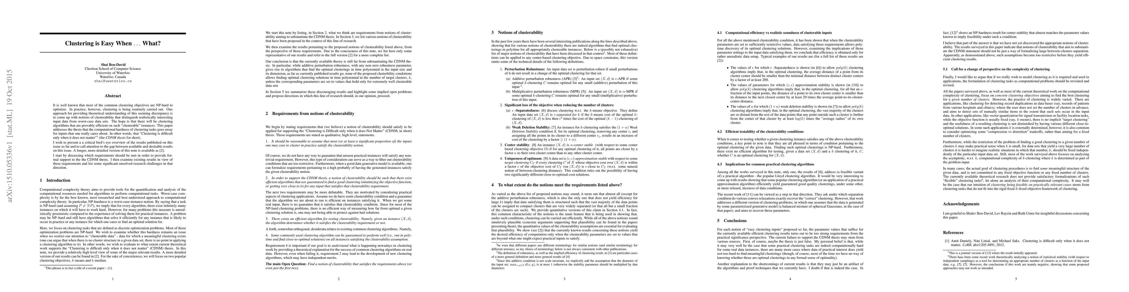 It is well known that most of the common clustering objectives are NP-hard to optimize. In practice, however, clustering is being routinely carried out. One approach for providing theoretical understanding of this seeming discrepancy is to come up with notions of clusterability that distinguish realistically interesting input data from worst-case data sets. The hope is that there will be clustering algorithms that are provably efficient on such "clusterable" instances. This paper addresses the thesis that the computational hardness of clustering tasks goes away for inputs that one really cares about. In other words, that "Clustering is difficult only when it does not matter" (the \emph{CDNM thesis} for short). I wish to present a a critical bird's eye overview of the results published on this issue so far and to call attention to the gap between available and desirable results on this issue. A longer, more detailed version of this note is available as arXiv:1507.05307. I discuss which requirements should be met in order to provide formal support to the the CDNM thesis and then examine existing results in view of these requirements and list some significant unsolved research challenges in that direction.