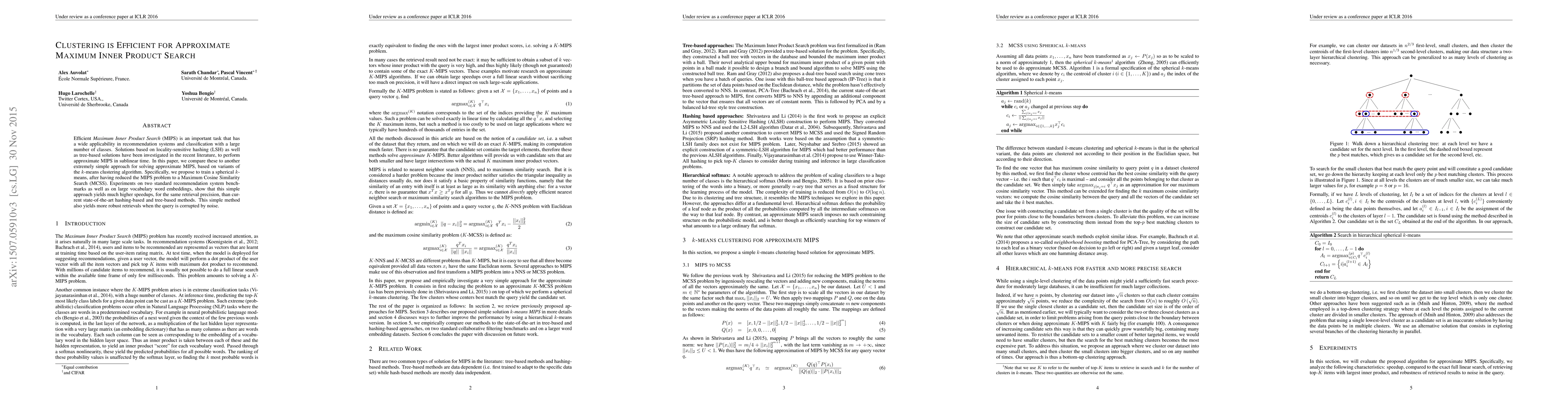 This paper proposes a k-means clustering approach for efficient approximate Maximum Inner Product Search (MIPS), demonstrating higher speedups and more robust retrievals compared to existing LSH and tree-based methods, especially under noisy queries. The method achieves comparable precision while significantly reducing computation time.